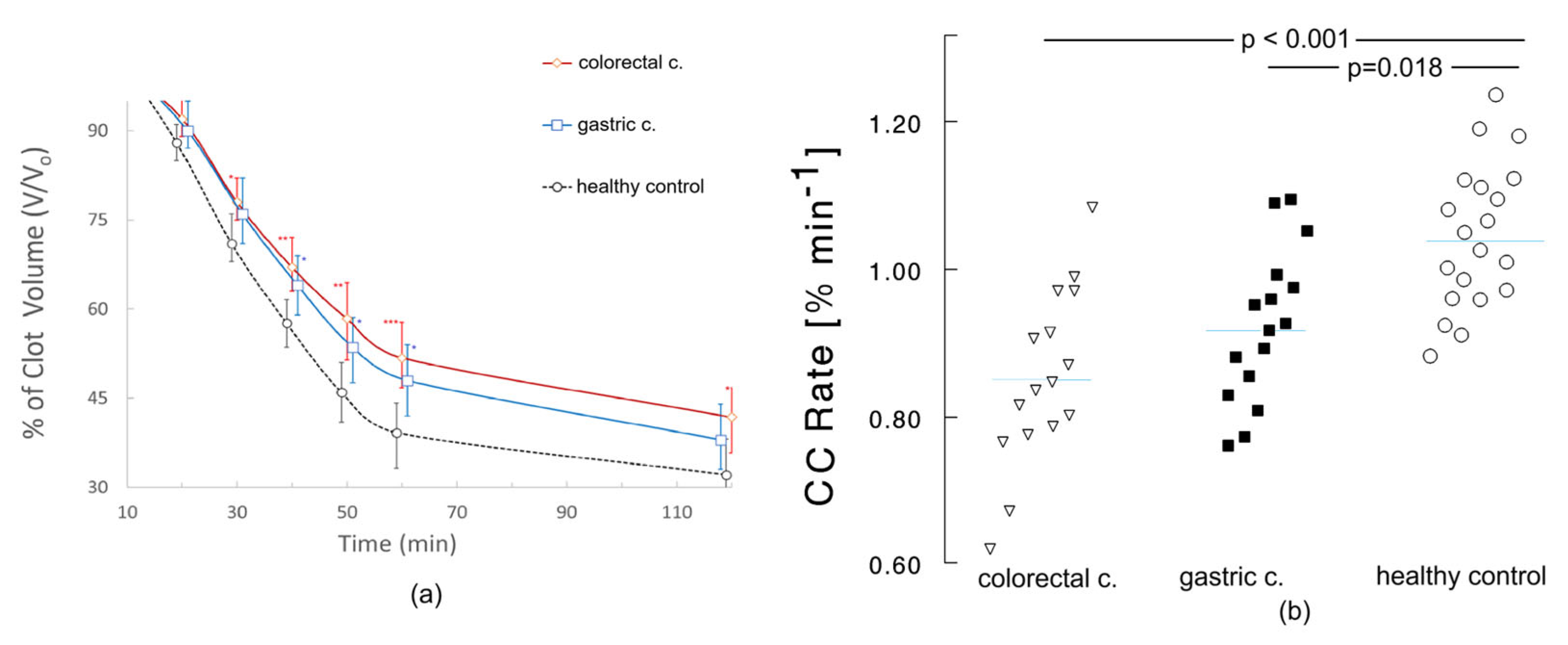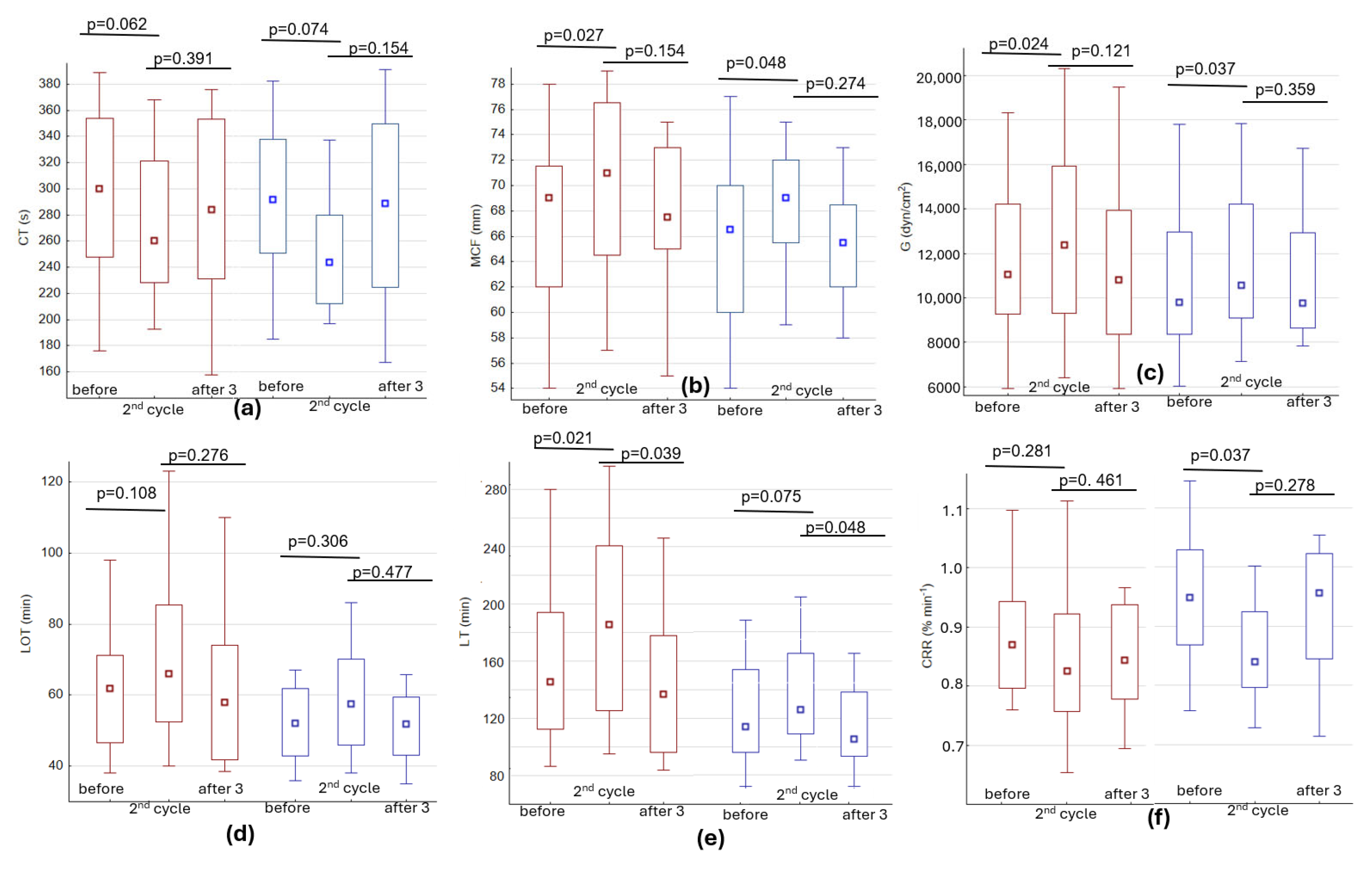 - Zhao, Z.S.; Qi, Y.C.; Wu, J.W.; Qian, L.H.; Hu, B.; Ma, Y.L. Thromboelastography (TEG) parameters as potential predictors of malignancy and tumor progression in colorectal cancer. World J. Surg. Oncol. 2023, 21, 354. [Google Scholar] [CrossRef]