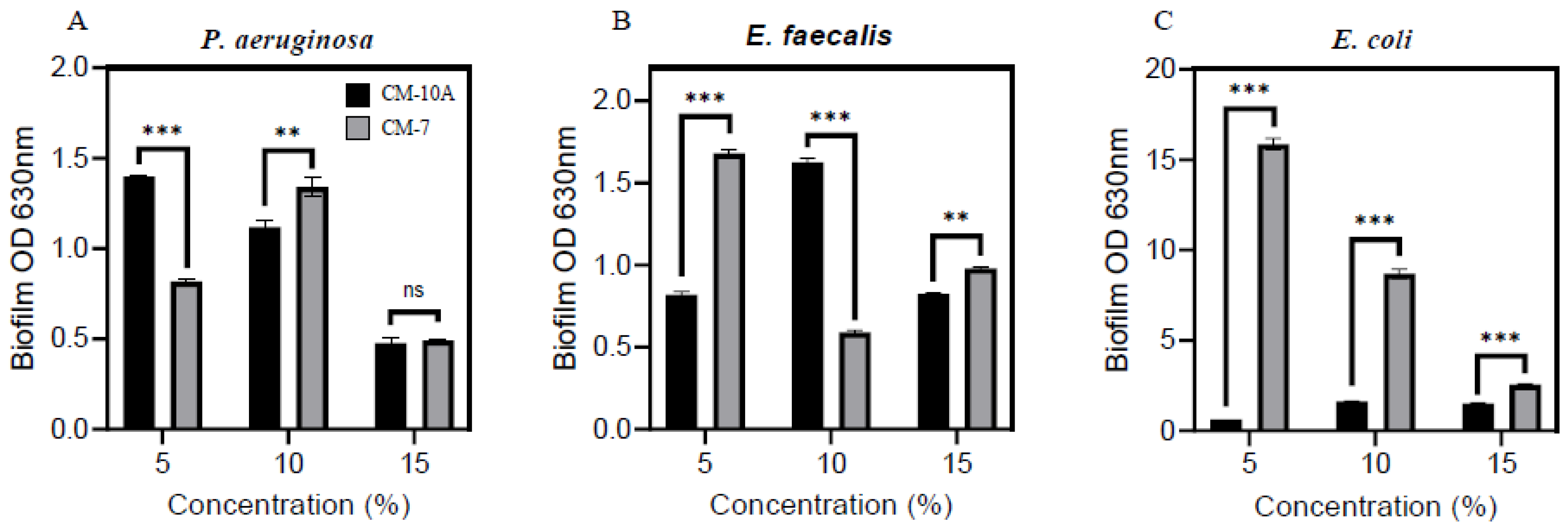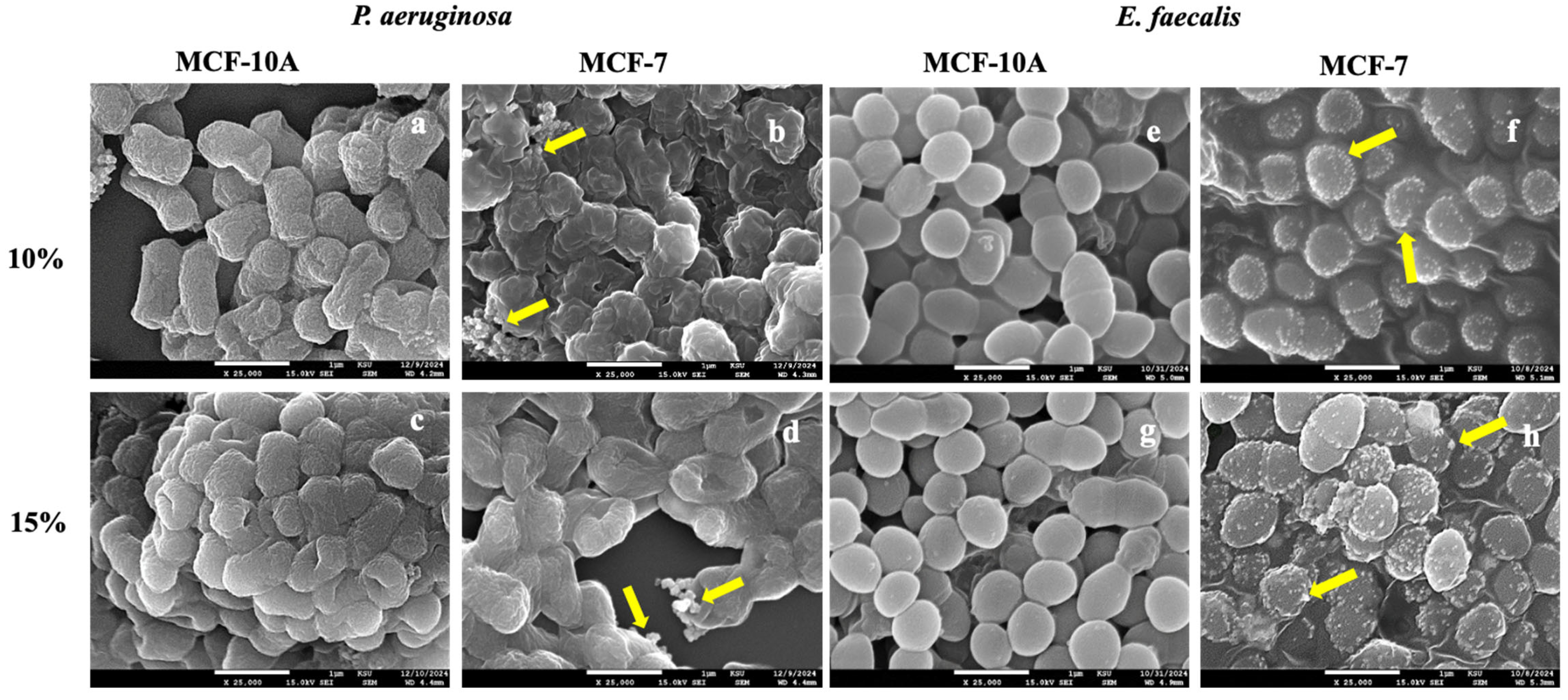 2.1. Conditioned-Media from MCF-7 Cancer Cells Induced Morphological Remodeling of P. aeruginosa and E. faecalis