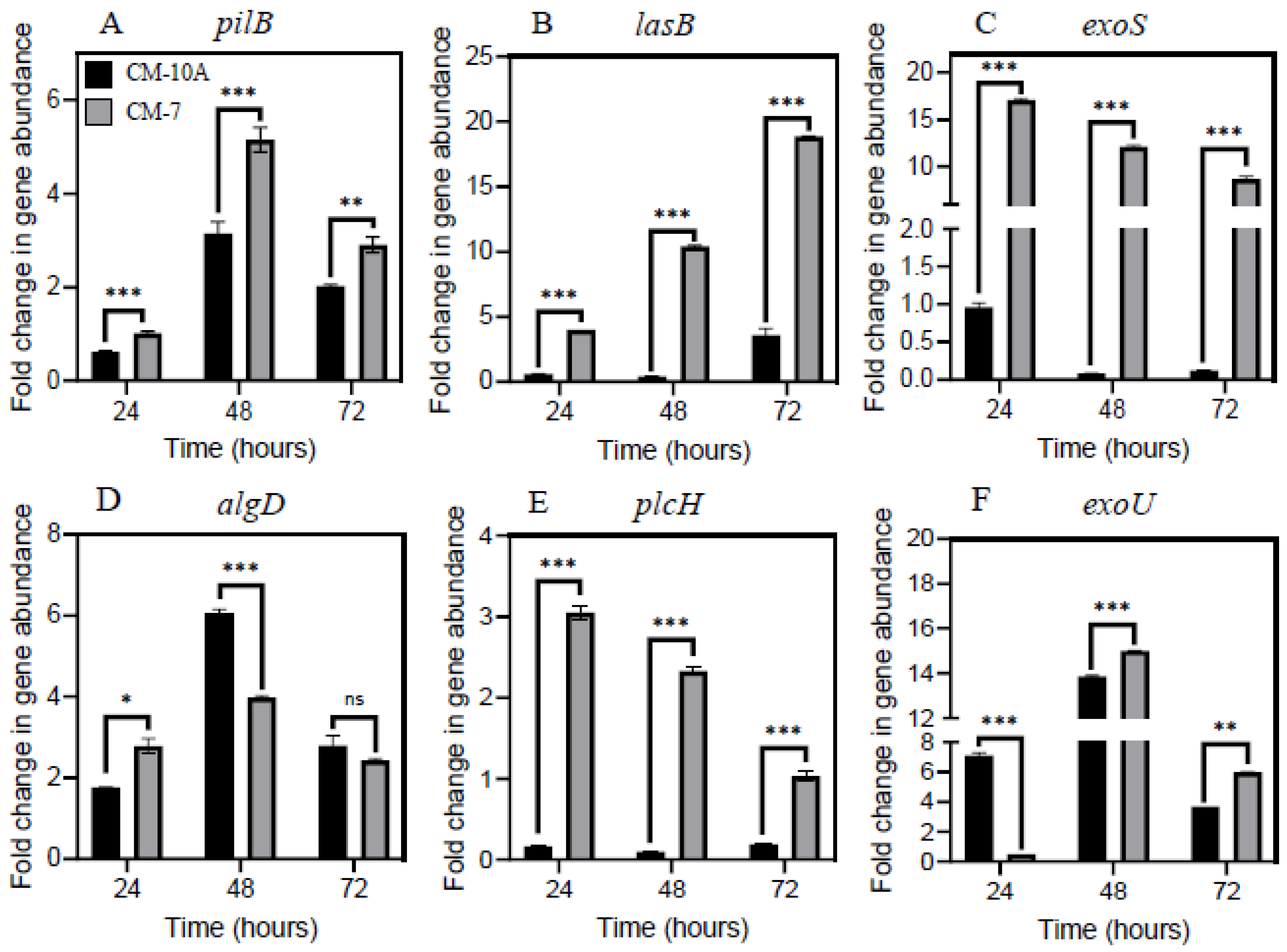 2.4. MCF-7 Breast Cancer Secretomes Modulate Virulence-Associated Gene Abundance in P. aeruginosa