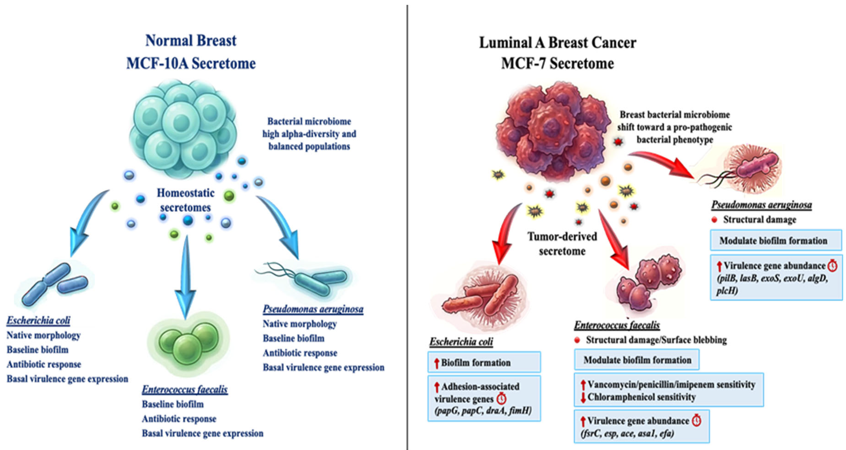 Breast-Cancer-Derived Secretomes from MCF-7 Cells Modulate Bacterial Pathogenic Traits