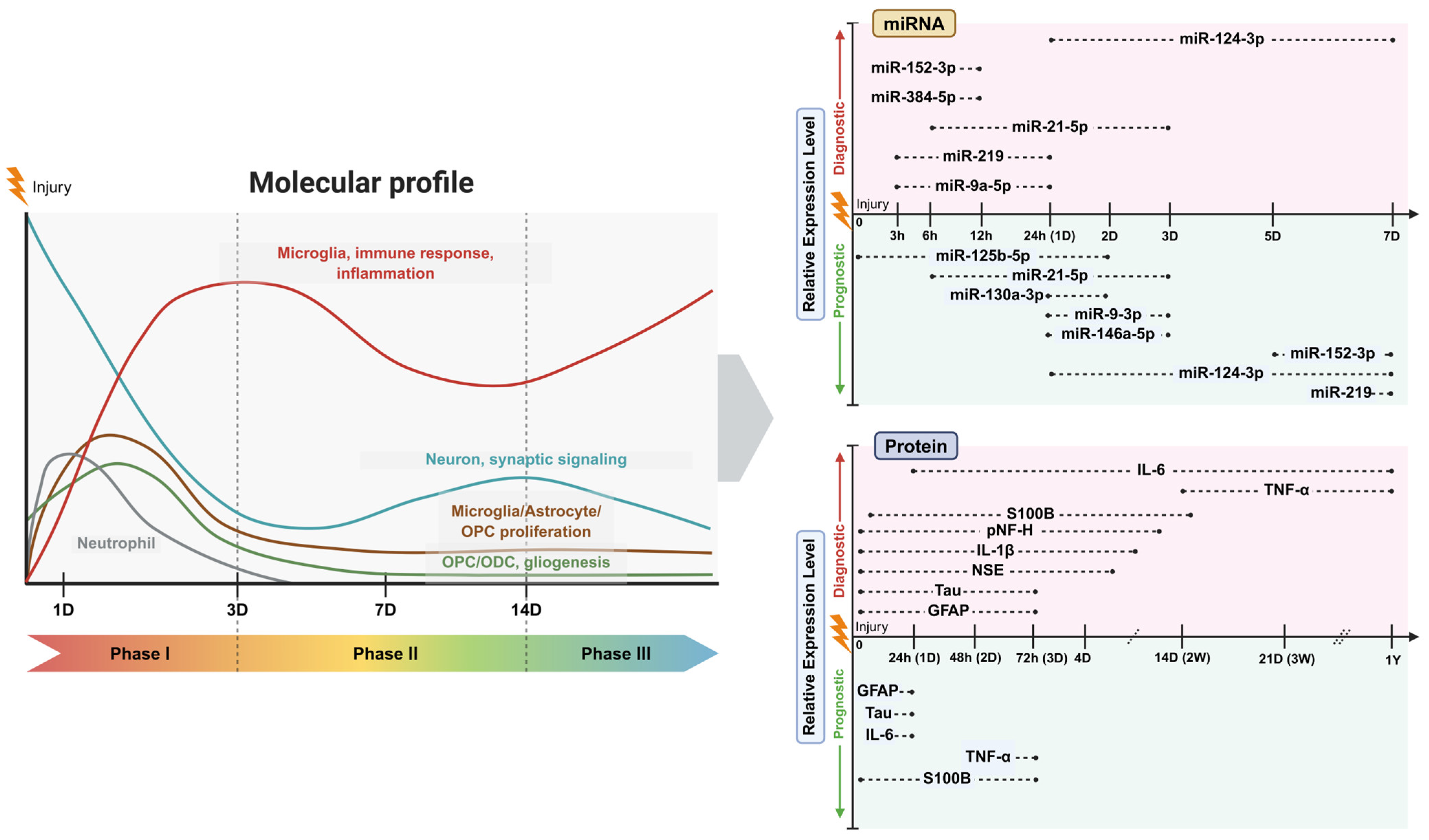 | miR-21-5p | Serum, spinal neurons, and circulating immune cells | Human (SCI cohort), rat | Extent of tissue destruction and SCI severity (AIS-related) and systemic immune activation | Stage of disease progression and motor functional outcome | Supported by preliminary human data | Low specificity, conflicting expression trends depending on the model | [110,111,112,113] |