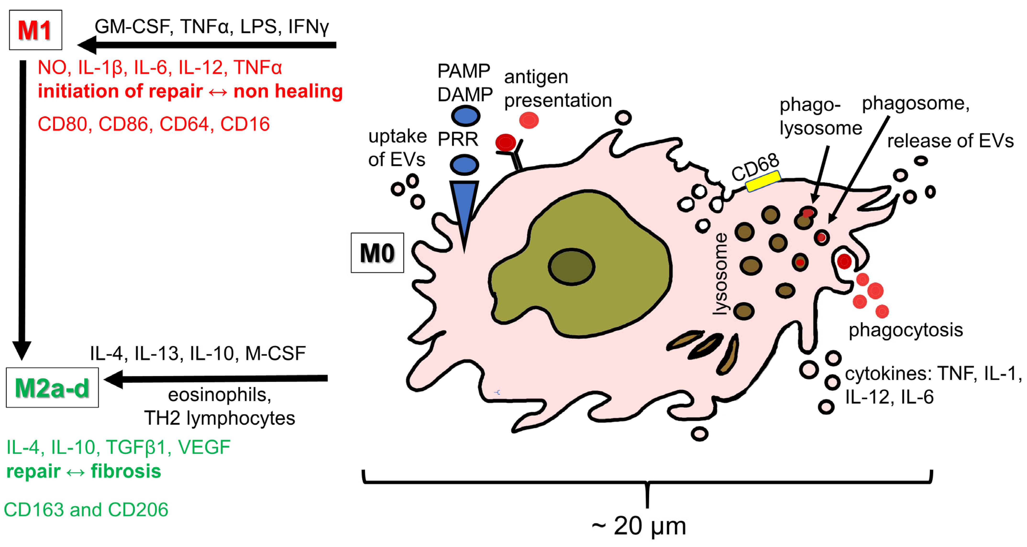 | Released factors | pro-inflammatory cytokines, e.g., TNFα, IL-1β, IL-6, IFNγ, and iNOS | anti-inflammatory cytokines: IL-10, IL-13, TGF-β, PDGF, IL-1 receptor antagonist, VEGF, arginase, IGF-1 | [98,99,101,102,103] |