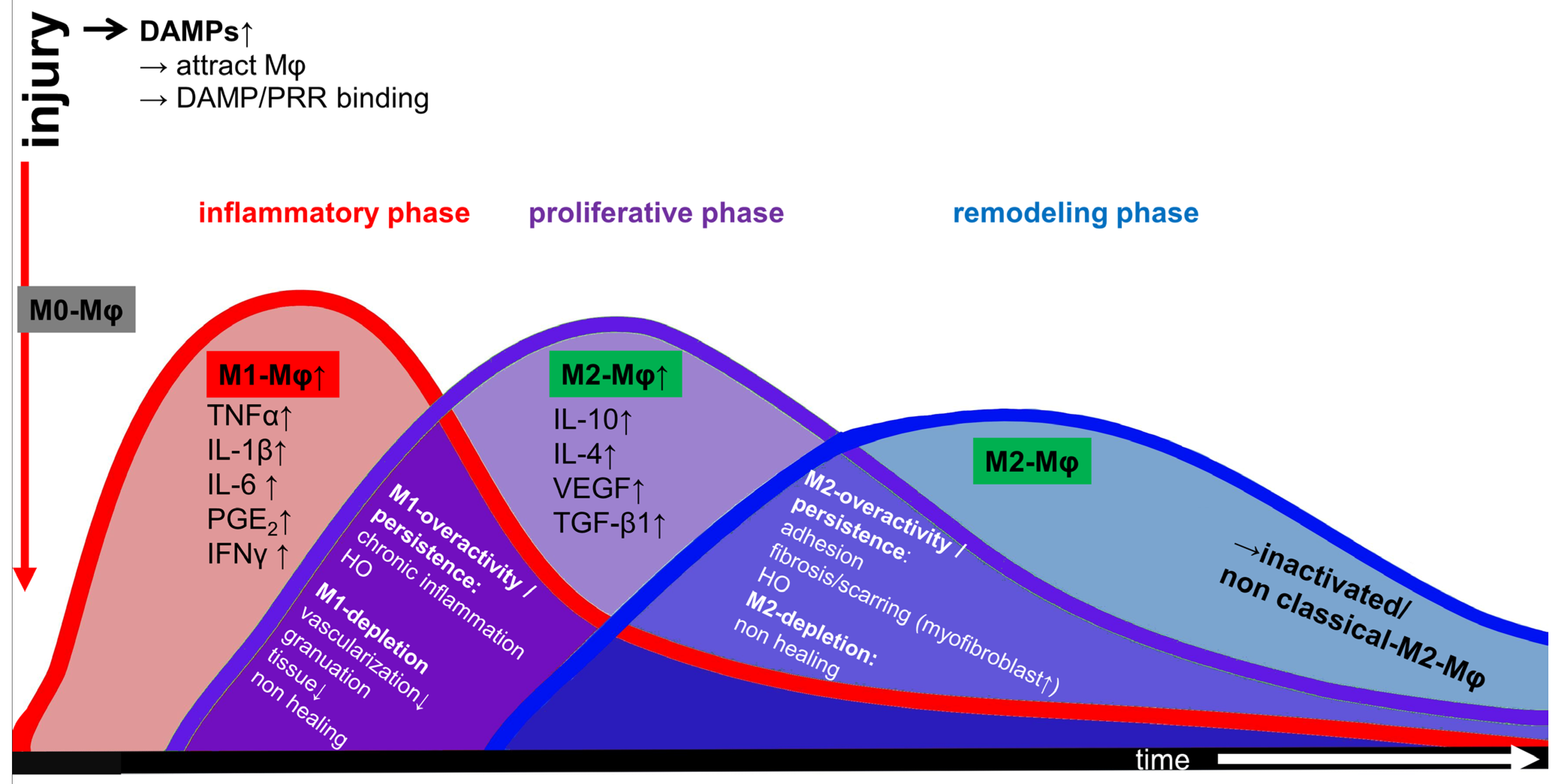 | Properties | pro-inflammatory: crucial in early stages of inflammation, M1↑: delayed healing | anti-inflammatory: crucial in late stages of inflammation and guide healing, M2↑: scarring, adhesion formation | [64,109,110,118,119] |