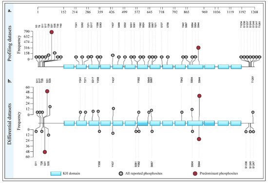 Lollipop plot visualization of phosphosites within HDLBP with their detection frequencies in global cellular phosphoproteomics datasets. (a) Phosphosites detected in the qualitative profiling datasets (b) Phosphosites detected in the quantitative differential datasets.