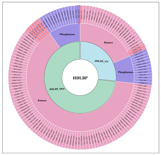 Circular diagram showing the co-regulated kinases and phosphatases. Color coding in the figure indicates kinases in pink and phosphatases in purple, while inner ring segments in light blue and light green correspond to HDLBP_S31 and HDLBP_S944, respectively.CPPs with predominant phosphosites and activity-associated sites marked in a red box.