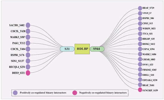 The binary and complex interactors of HDLBP were retrieved from various databases like HPRD, BIND, BioGRID, ConsensusPathDb, CORUM, and RegPhos. The list of binary partners and complex interactors are given in the Supplementary Materials S4C,D. We identified eight binary interactors that are positively co-regulated and one interactor which is negatively co-regulated for the S31 predominant site. Similarly, we identified 16 positive and 1 negative co-regulated binary interactor of S944. Figure 7 shows the co-regulated binary interactors.
