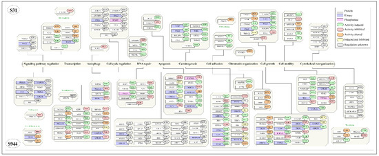 Protein kinases and phosphatases act as molecular switches, turning protein activity on or off through phosphorylation and dephosphorylation [40]. At the S31 site, 25 CPPs identified as kinases and 12 as phosphatases showed positive co-regulation, whereas only 2 kinase CPPs exhibited negative co-regulation. In contrast, for the S944 site, 87 kinase CPPs and 13 phosphatase CPPs were positively co-regulated, while 6 kinases and 1 phosphatase exhibited negative co-regulation. The list of kinase CPPs and phosphatase CPPs are given in Figure 5 and Supplementary Materials S4A.