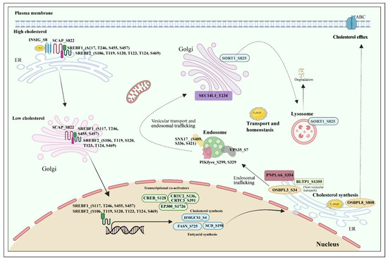 In addition to its well-characterized functions in RNA metabolism, HDLBP also plays significant roles in lipid metabolism and cholesterol transport. Consistent with these known functions, our analysis also revealed several co-regulated proteins involved in lipid homeostasis. The cellular cholesterol levels are mainly regulated by SCAP, SREBP, and INSIG. When cholesterol levels are high, these proteins form a complex that anchors to the endoplasmic reticulum (ER), which acts as a cholesterol sensor [69,70]. When cellular cholesterol levels are low, the SCAP–SREBP–INSIG complex dissociates and the SCAP–SREBP complex is then transported to the Golgi apparatus, where SREBP undergoes proteolytic cleavage by SCAP to become active. The activated SREBP then translocates to the nucleus, where it promotes the transcription of key genes involved in cholesterol and fatty acid biosynthesis, including HMGCS1, FASN, and SCD [71,72,73]. Although SREBP and INSIG were detected in the initial datasets, they did not meet the cutoff criteria. This may be because acetylation/deacetylation is the major post-translational modification involved in regulating SREBP, which could be the reason for the limited number of phosphorylation sites being detected [13,74]. In addition, the transcriptional co-activators of CREB responsive lipogenic genes, such as CREB1, CRTC2, CRTC3, and EP300, were found among the co-regulated proteins [75,76,77]. Furthermore, several proteins involved in lipid transport and intracellular trafficking were found to be co-regulated with HDLBP, including OSBPL8, OSBPL3, BLTP1, SEC14L1, and PNPLA6 [78,79,80,81]. Among these, BLTP1 is known to mediate non-vesicular lipid transport [82]. In addition, vesicular trafficking proteins such as SORT1, VPS35, SNX17, and PIKFYVE were also identified [83,84,85]. In short, our results are consistent with previous studies implicating the role of HDLBP in lipid metabolism, cholesterol biosynthesis, and intracellular trafficking.