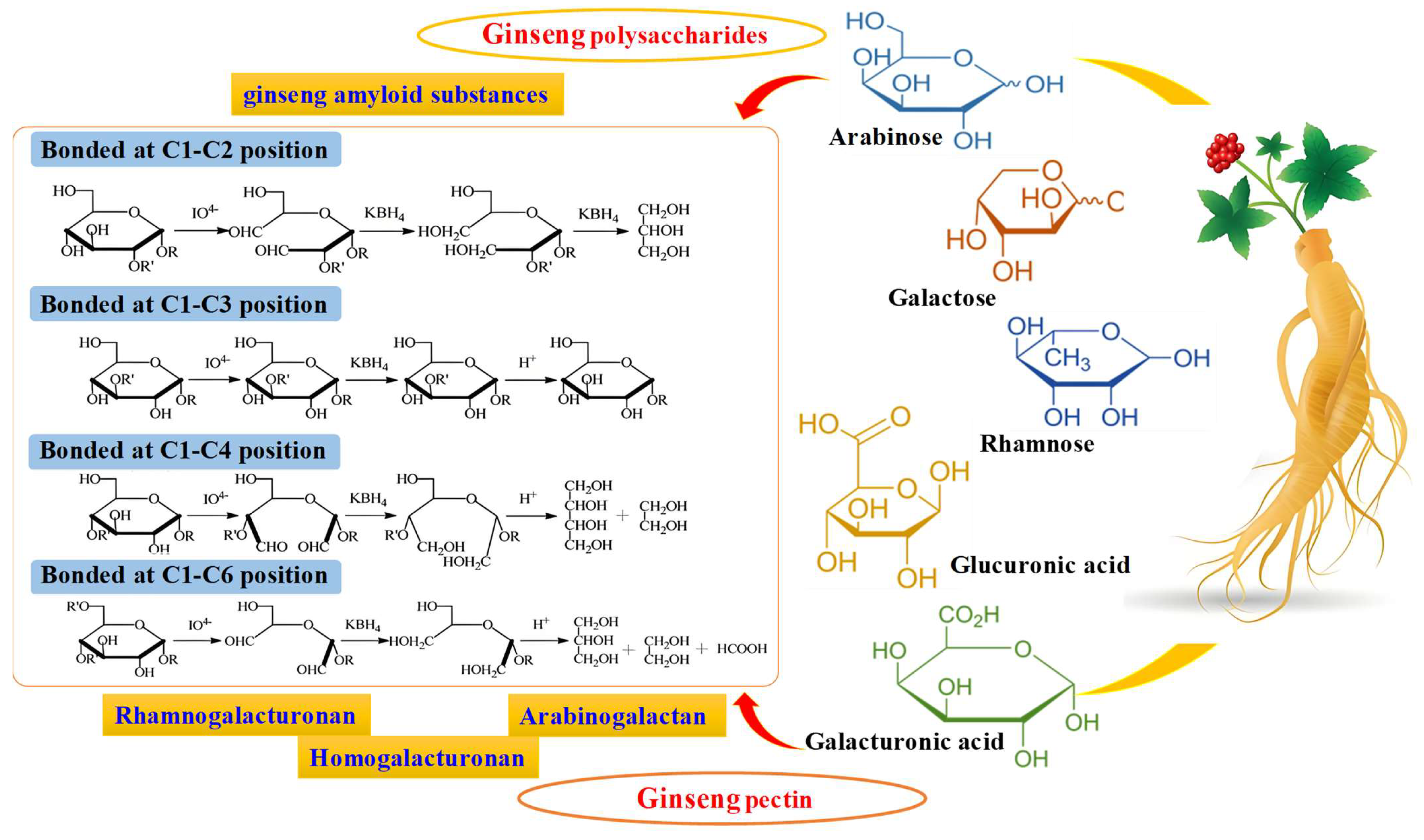 P. ginseng. They are complex biomacromolecules formed by the connection of arabinose (Ara), galactose (Gal), rhamnose (Rha), galacturonic acid (Gal A) and glucuronic acid (Glu A) through glycosidic bonds, with a molecular weight range of 3.5 × 10