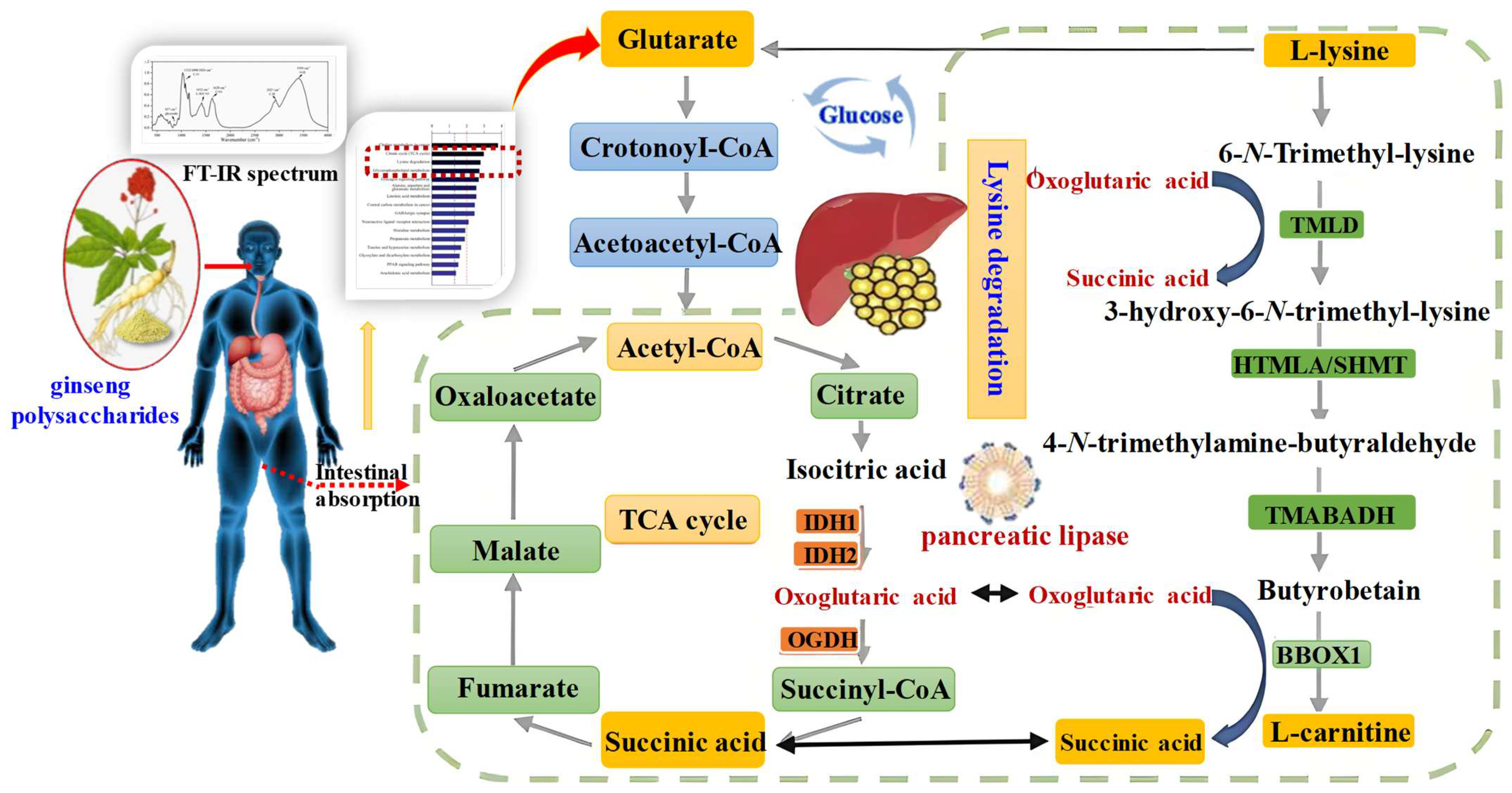 - Liu, Q.; Zhang, Z.; Ji, P.; Liu, J.; Chen, B.; Ma, E.; Qi, H.; Hou, T.; Huang, Q.; Ding, L.; et al. Ginseng polysaccharide components attenuate obesity and liver lipid accumulation by regulating fecal microbiota and hepatic lysine degradation. Int. J. Biol. Macromol. 2024, 269, 131872. [Google Scholar] [CrossRef] [PubMed]