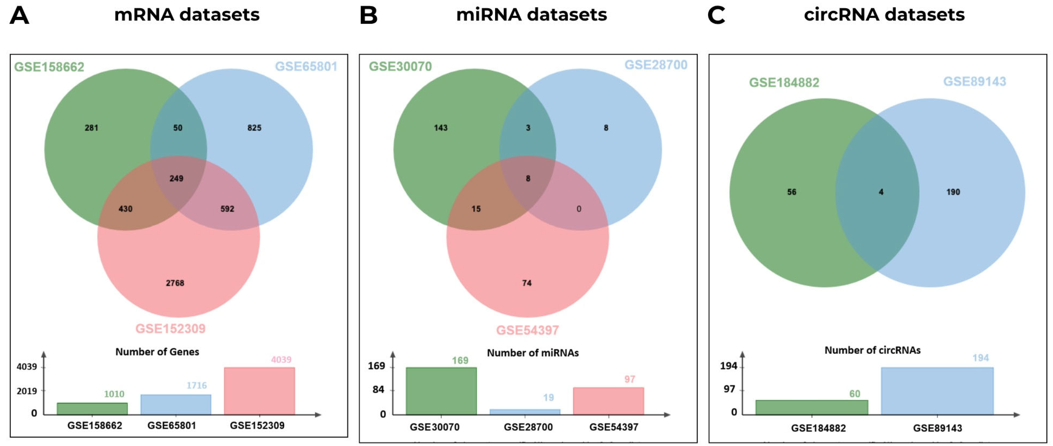 4.2. Identification of DEGs, DEmiRNAs, and DEcircRNAs