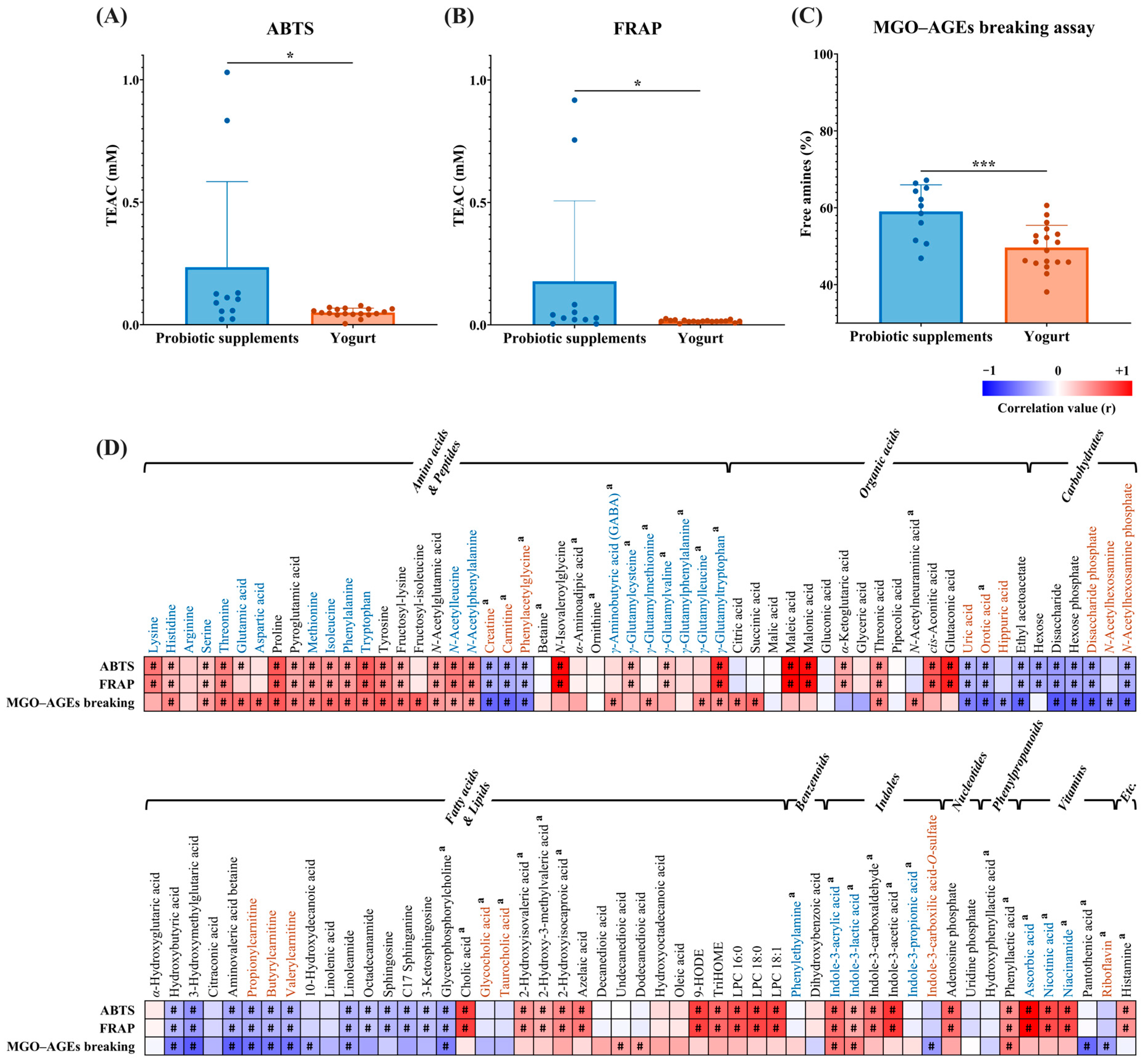 2.2. Targeted Metabolomic Comparison of Bioactive Metabolites Between Probiotic Supplements and Yogurt