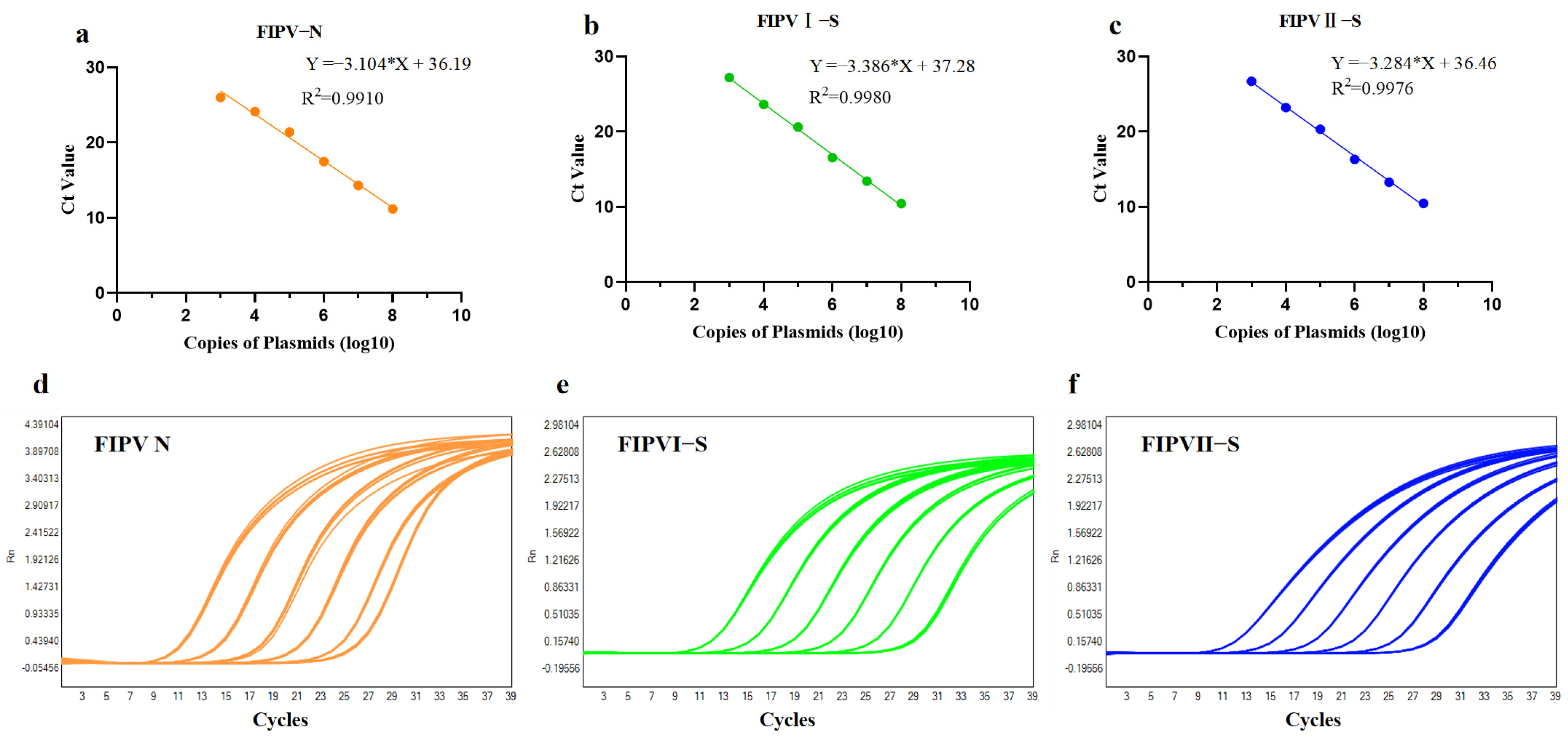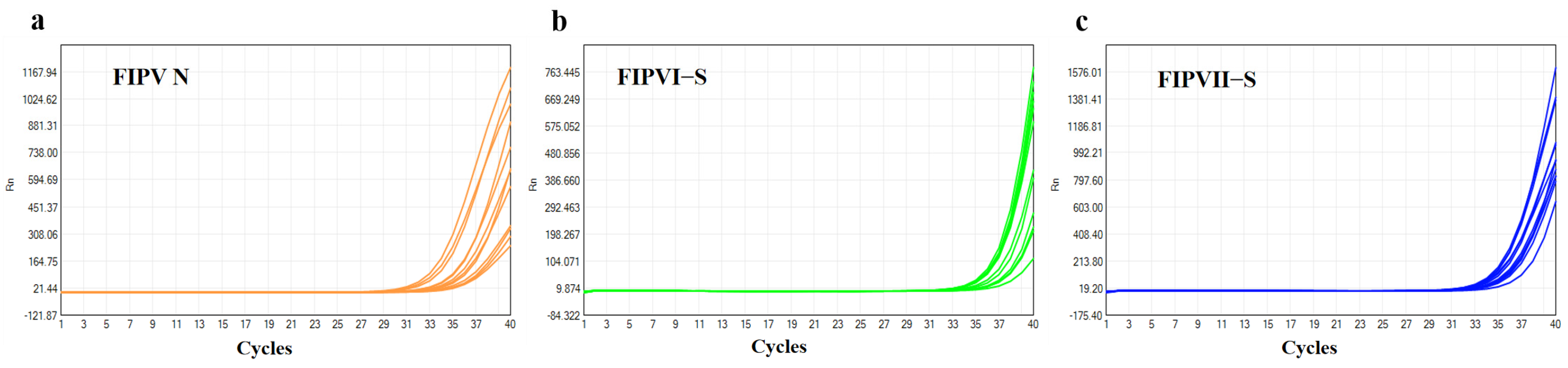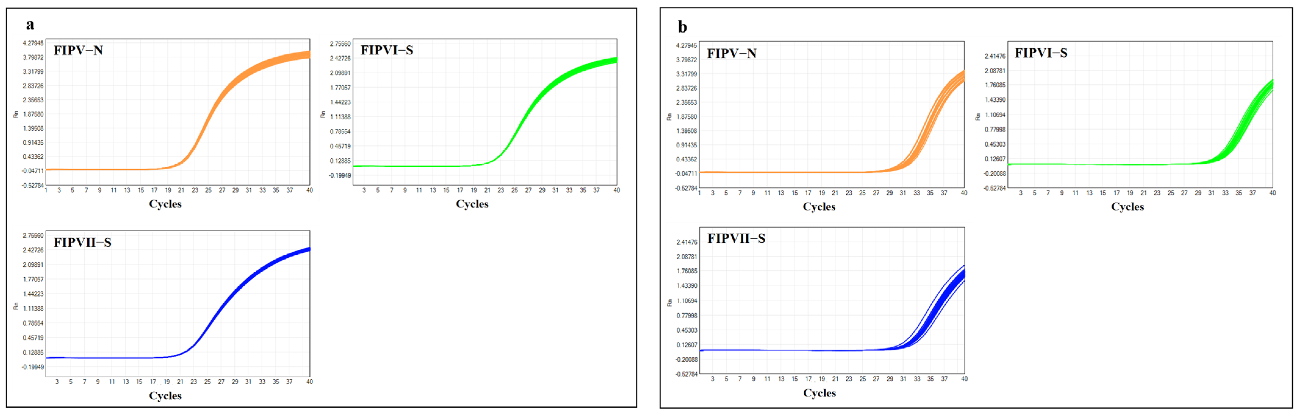 - Liu, Y.; Zhu, Z.; Du, J.; Zhu, X.; Pan, C.; Yin, C.; Sun, W. Development of Multiplex Real-Time PCR for Simultaneous Detection of SARS-CoV-2, CCoV, and FIPV. Front. Vet. Sci. 2024, 11, 1337690. [Google Scholar] [CrossRef]