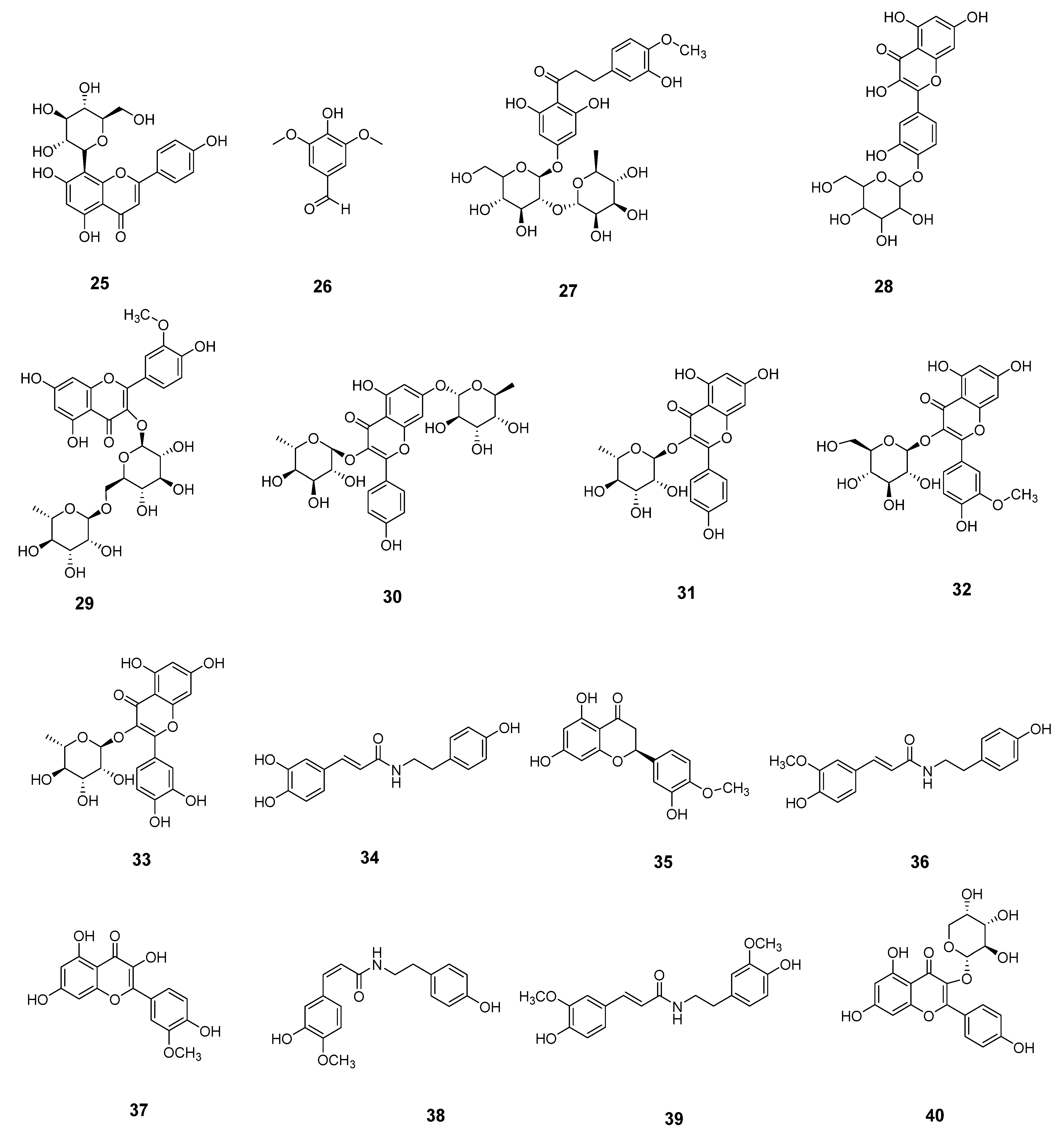 | 37 | 9.5229 | 3′-Methoxy-4′,5,7-trihydroxyflavonol | C16H12O7 | [M − H]− | 315.0505 | 315.0527 | 6.98 | 315, 300 | [36] |