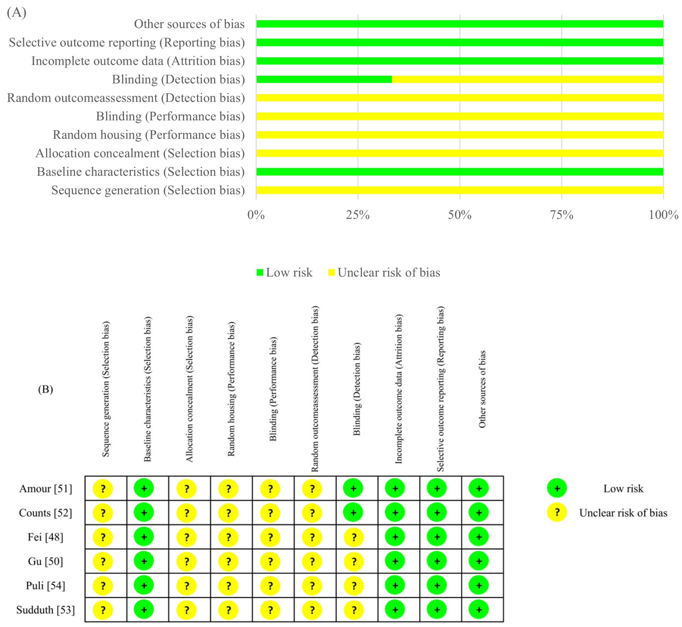 | First Author | Age of Testing Time | Open-Field Experiment Test | Novel Object Recognition Test | Barnes Maze Test | Light–Dark Box Emergence Test | Aβ40 in Plasma | Aβ42 in Plasma | Aβ40 in Brain | Aβ42 in Brain | Aβ42/Aβ40 in Brain | Aβ Deposition in Brain | Tau Deposition in Brain |