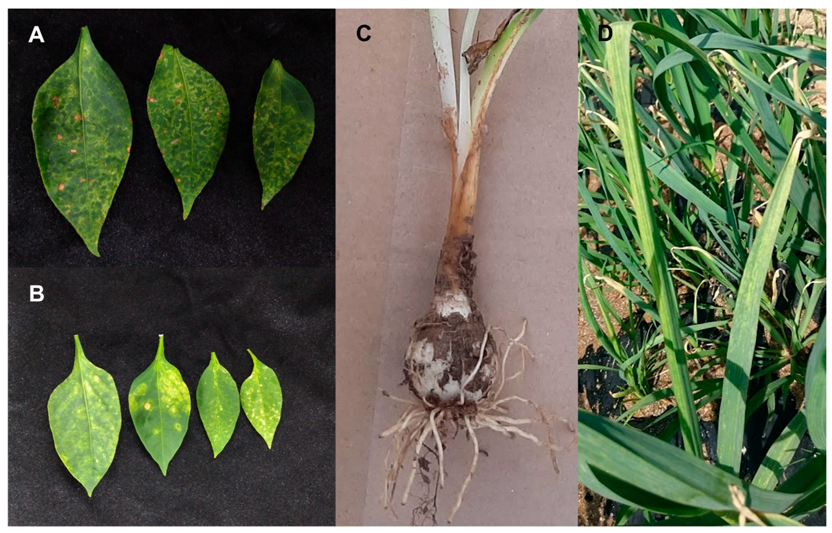 Visual inspection of field samples revealed distinct virus-like symptoms in pepper and garlic plants collected for comparative virome analysis (