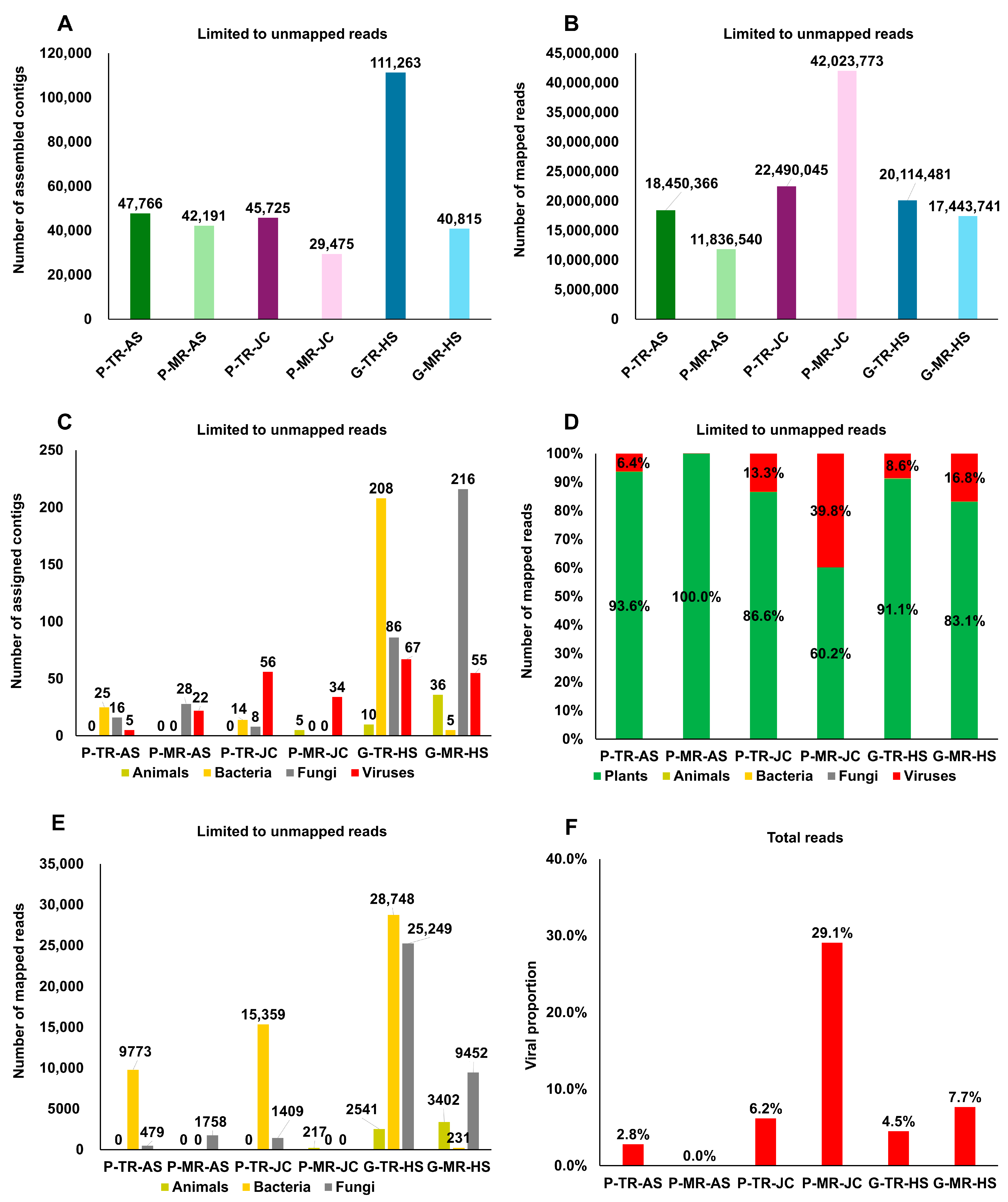 Table 3). In pepper libraries, most contigs derived from Viridiplantae, reaching 29,436–47,720 contigs and 11.8–25.3 million reads per library (e.g., 42,141 contigs and 11,832,565 reads in P-MR-AS; 45,647 contigs and 19,472,608 reads in P-TR-JC), whereas bacterial, fungal and animal assignments were rare (