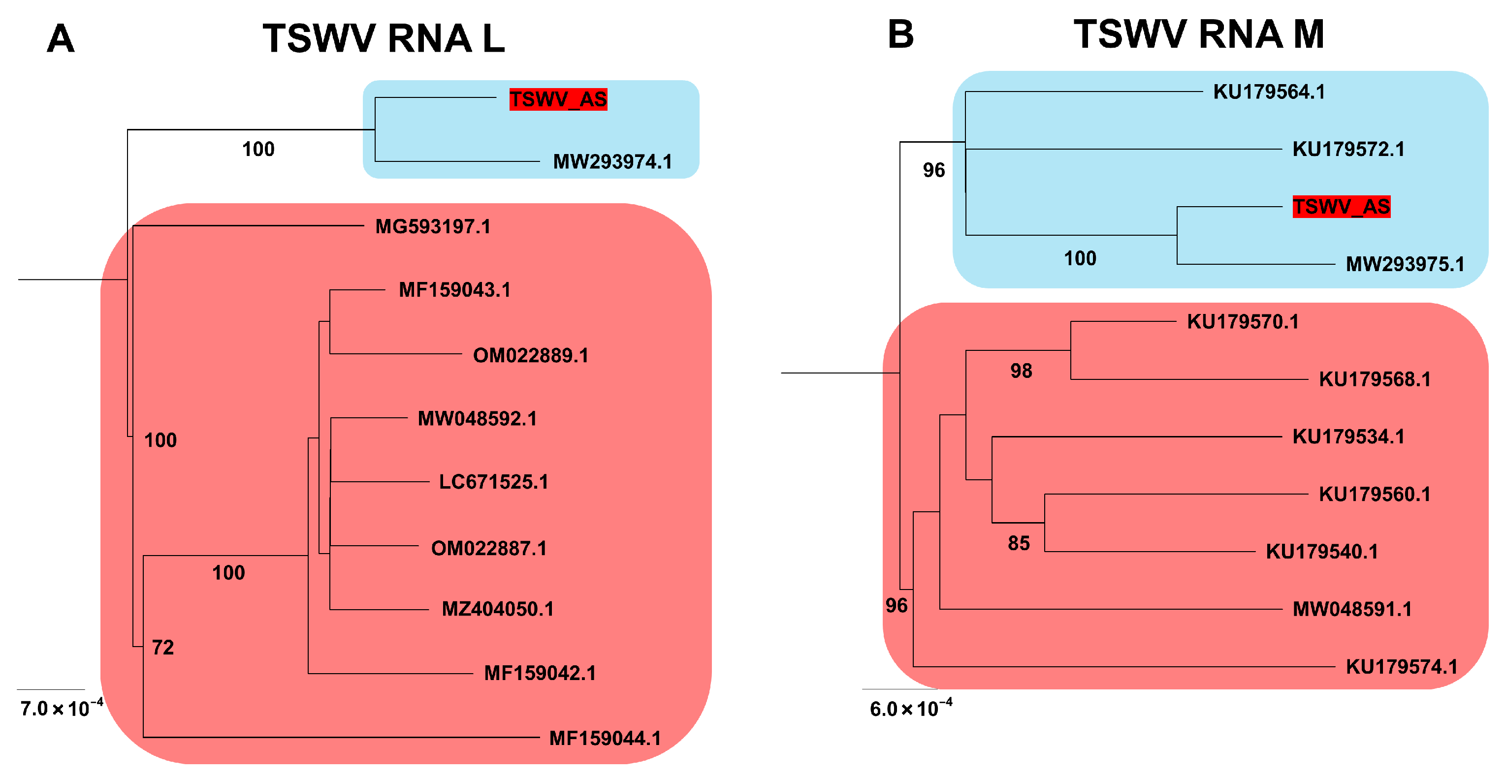 Figure 5A). A similar pattern was observed for RNA M, where TSWV_AS clustered tightly with MW293975.1 and additional Korean isolates (KU179564.1, KU179572.1), again forming a monophyletic group distinct from other global strains (