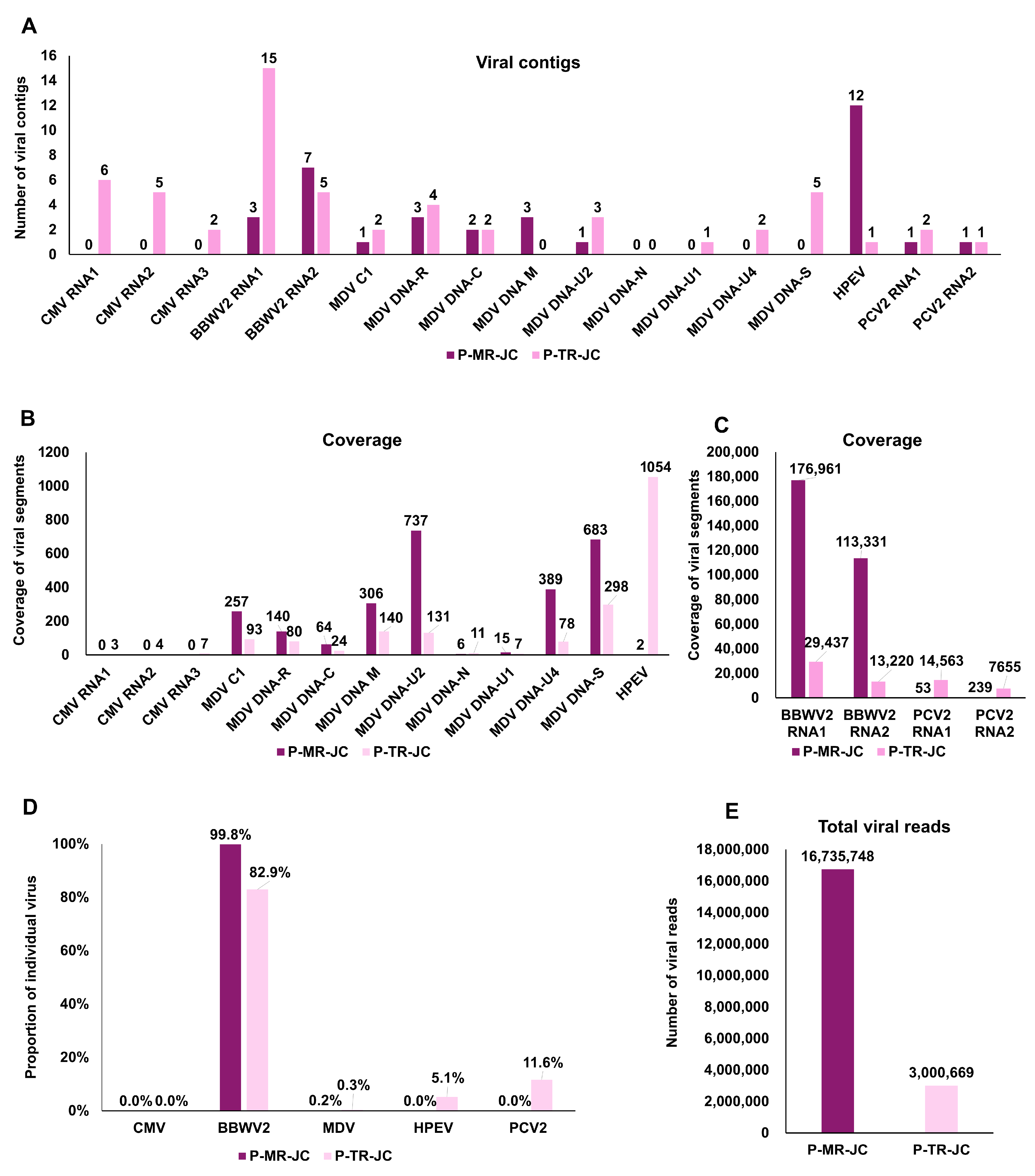 Figure 6A–C). HPEV and PCV2 were detected in both libraries but displayed higher segment coverages and read counts in P-TR-JC, consistent with improved recovery of non-polyadenylated or low-abundance persistent viruses in ribo-depleted libraries (