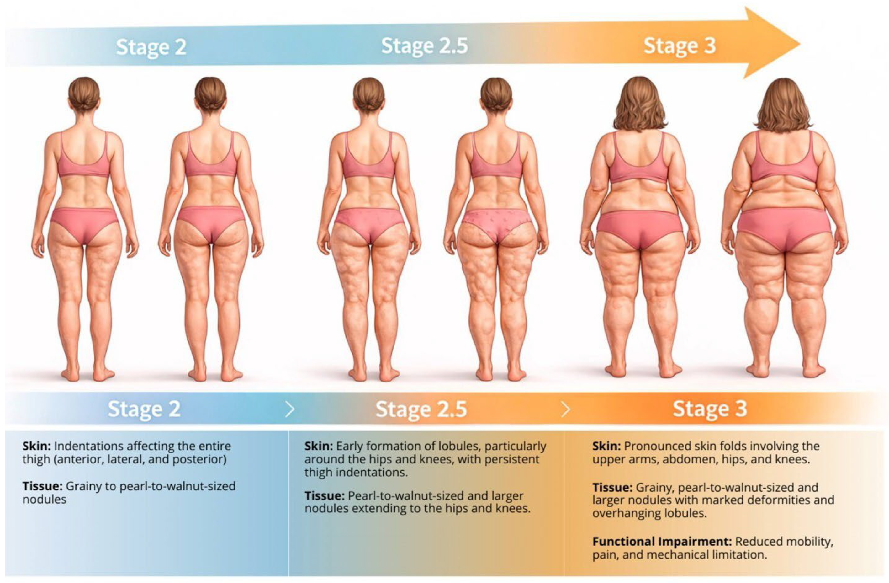 - Al-Ghadban, S.; Evancio, J.V.; Alfiscar, P.E.F.; Herbst, K.L. New Characterization of Lipedema Stages: Focus on Pain, Water, Fat and Skeletal Muscle. Life 2025, 15, 1397. [Google Scholar] [CrossRef]