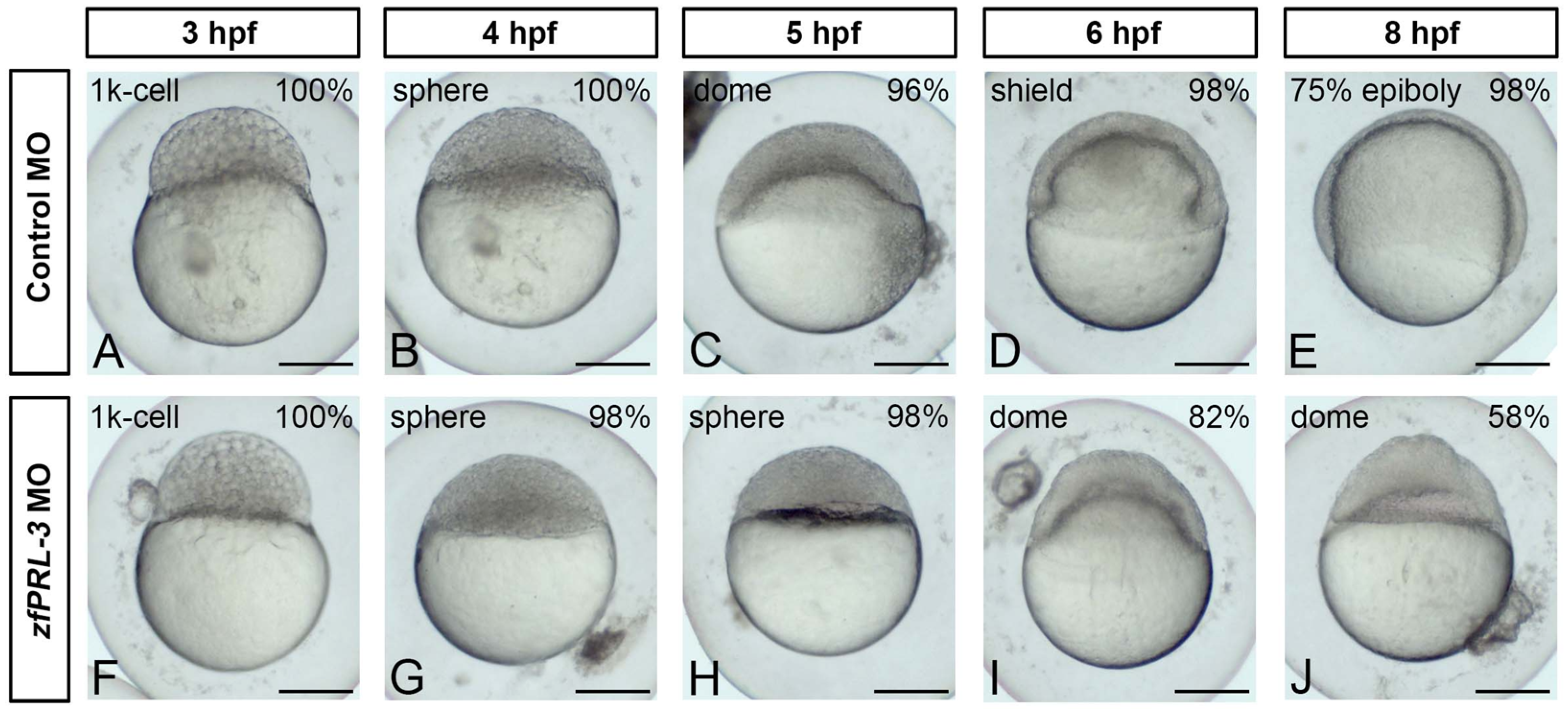 2.2. Zebrafish PRL-3 Knockdown Initiates Developmental Delay from the Sphere Stage