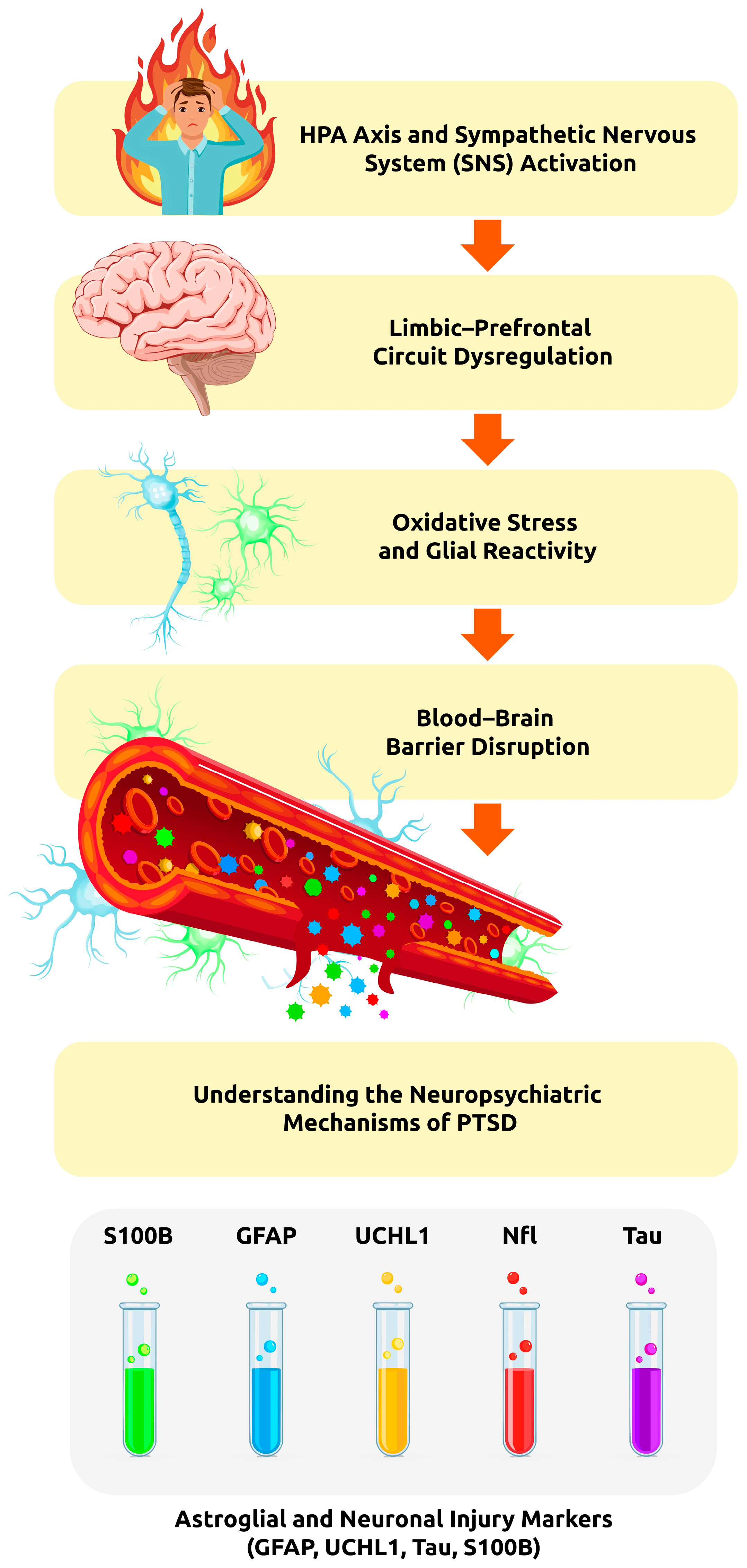 | GFAP | Astrocytes | Structural stability of astrocytic cytoskeleton; maintenance of BBB integrity | Reflects astroglial reactivity, neuroinflammation, and BBB disruption induced by chronic stress and HPA axis dysregulation | Marker of astrocyte activation and BBB damage; useful for monitoring stress-related brain injury and treatment response |
