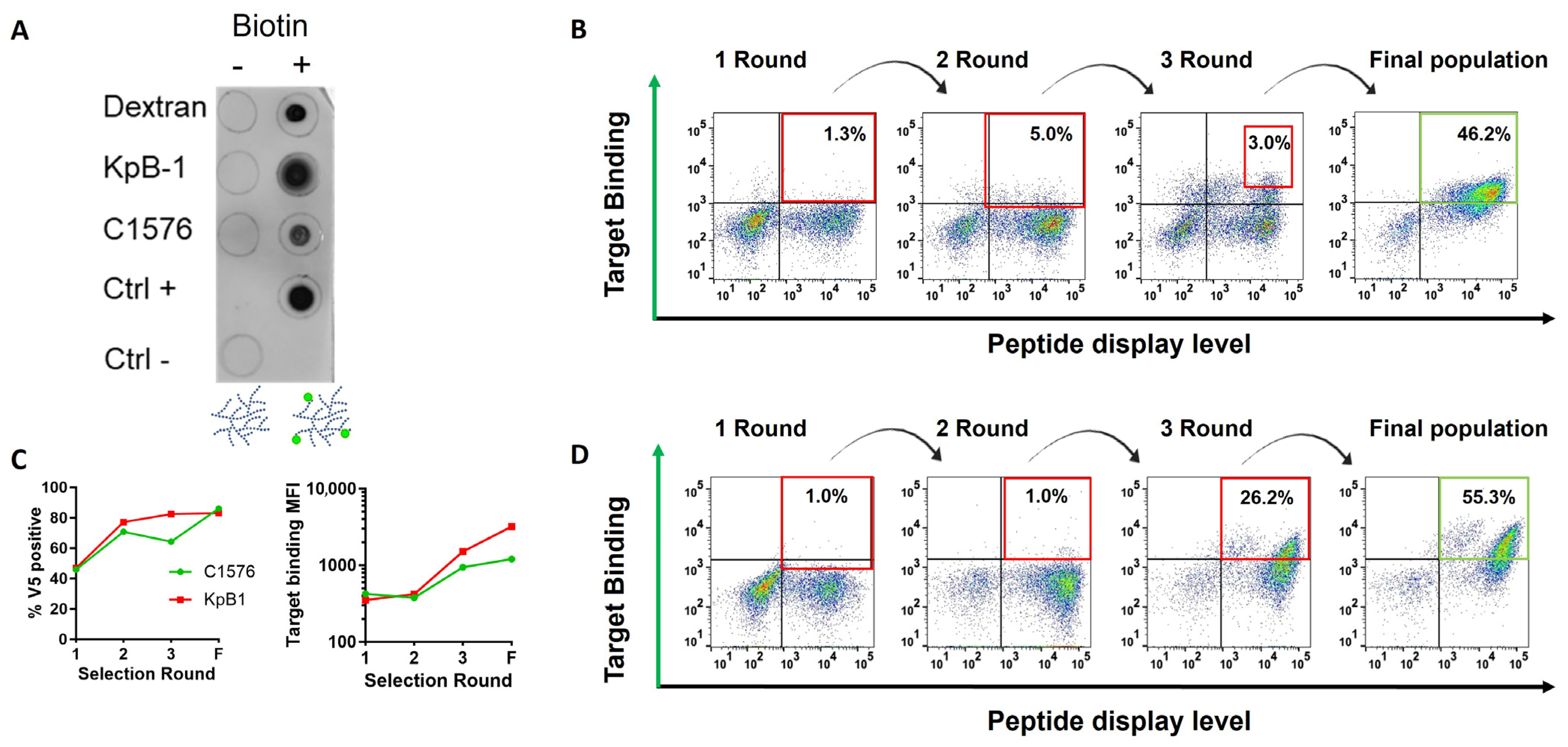 The library was then subjected to iterative selection cycles to enrich for peptides capable of binding biofilm-associated polysaccharides. Selection was performed via fluorescence-activated cell sorting (FACS), which require biotinylated target molecules. To this end, purified EpoI C1576 and CPS KpB-1 were biotinylated, and successful modification was confirmed by