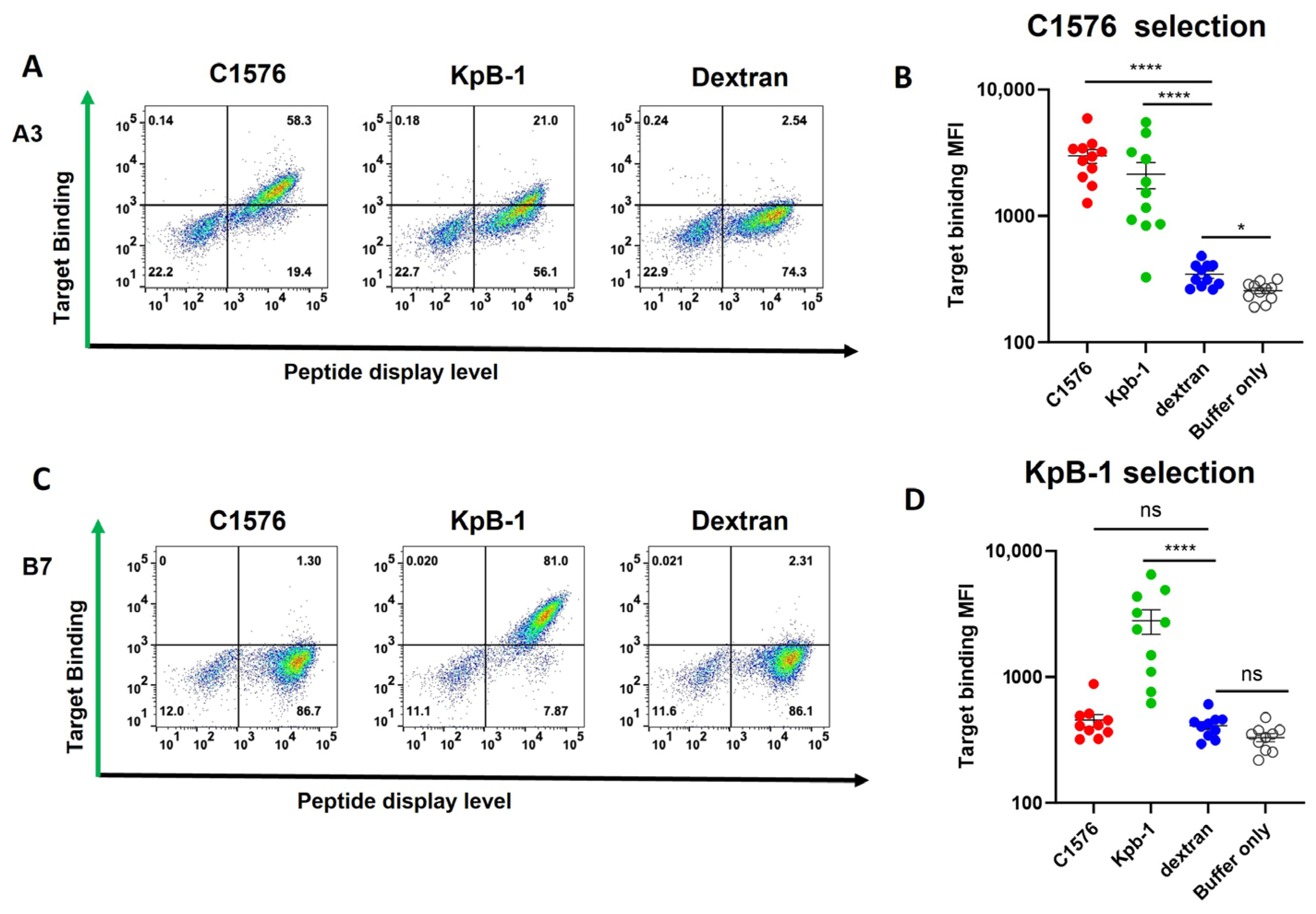 At the end of the selection process, individual yeast colonies were screened to identify clones expressing peptides with specific binding to biofilm-associated polysaccharides. Twenty clones were randomly selected from the EpoI C1576 selection (referred to A clones), and forty from the CPS KpB-1 selection (referred to B clones). Each clone was analyzed by flow cytometry to assess binding specificity towards the two target polysaccharides (EpoI C1576 and CPS KpB-1) and the control polysaccharide dextran. Representative binding profiles for one clone from each selection are shown in