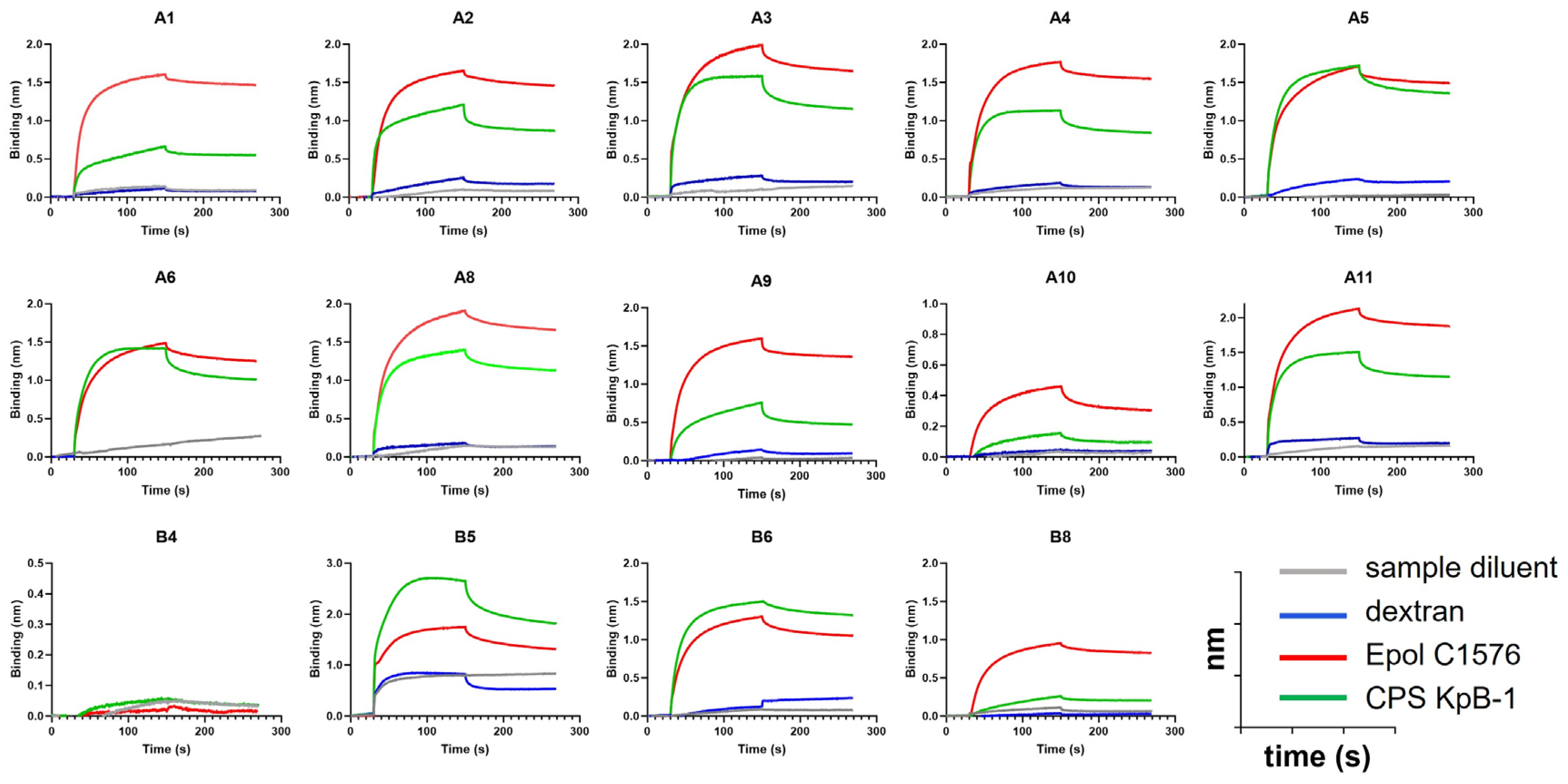 Figure 3B) consistently showed strong binding to the target polysaccharide, with negligible interaction with dextran. In contrast, CPS KpB-1-derived clones (