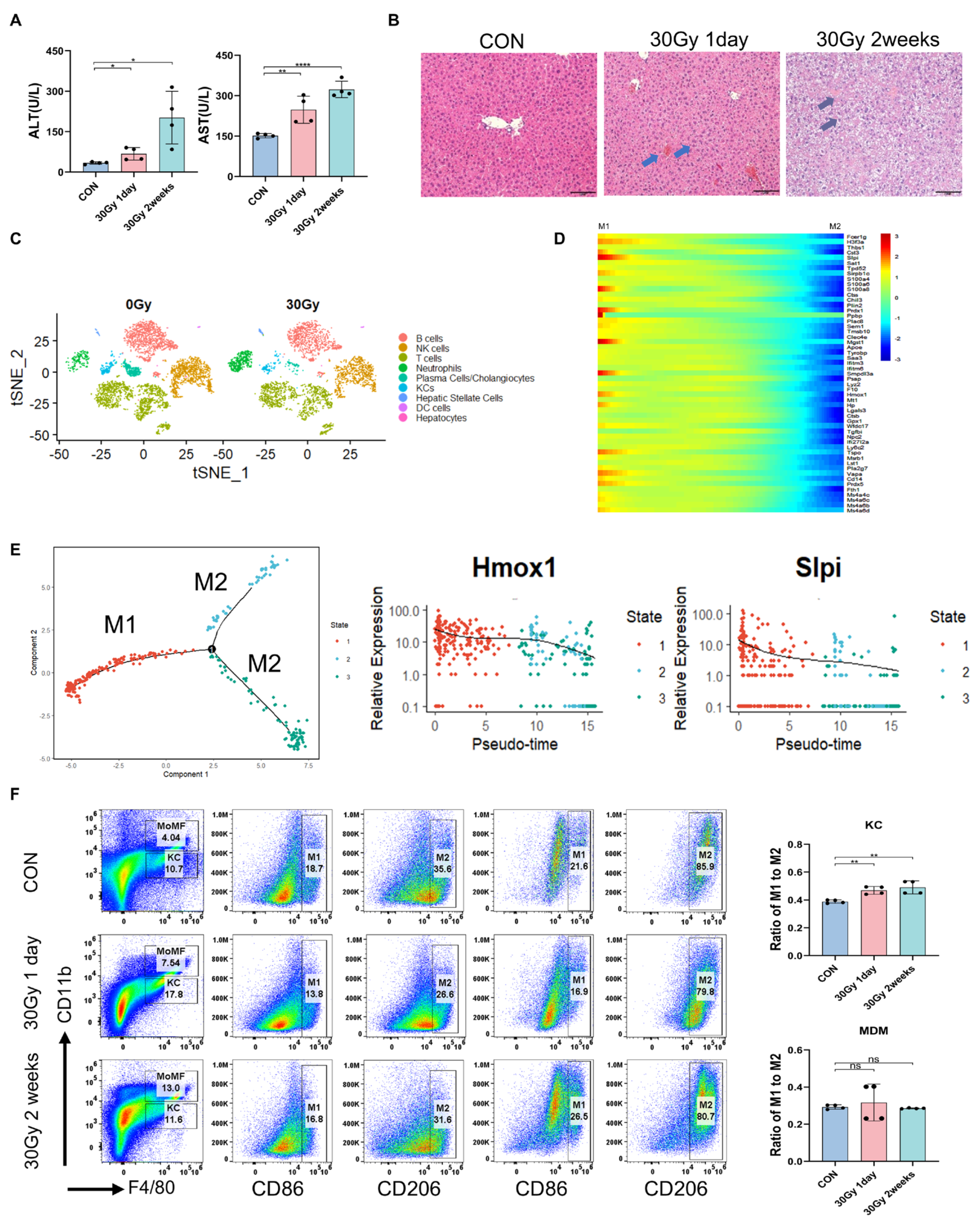 2.2. Radiation-Induced M1-Type Reprogramming of KCs Contributes to the Regulation of RILD