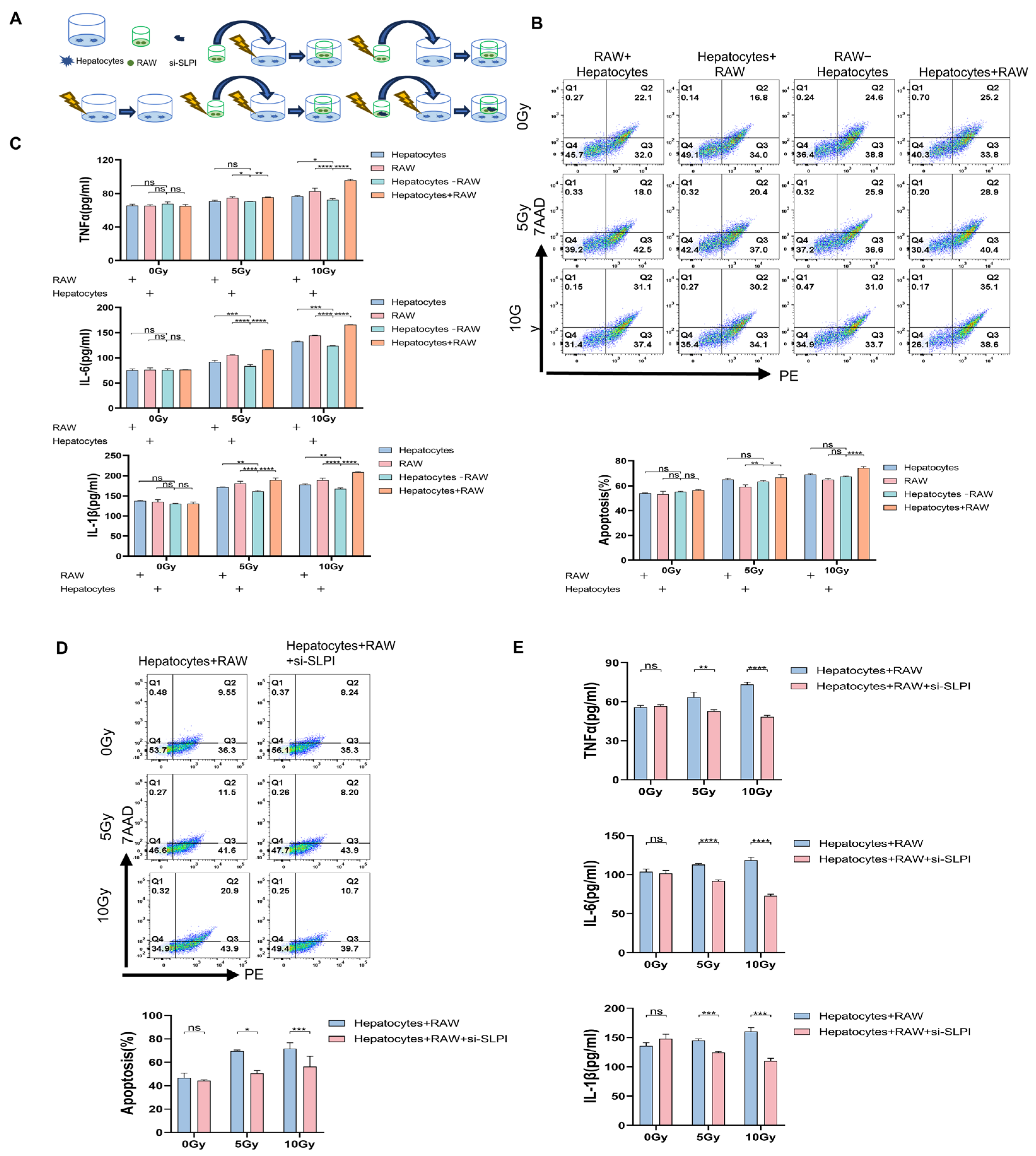 - siSLPI liposome delivery model: similarly, male C57BL/6J mice (6–8 weeks old) were randomly divided into four groups: the NC group (n = 5), siSLPI group (siSLPI liposome only, n = 5), IR group (irradiation only, n = 5), and IR + siSLPI group (siSLPI liposome + irradiation, n = 5). Mice in the siSLPI groups were administered siSLPI-loaded liposomes at a dose of 2 mg/kg via tail vein injection. Twenty-four hours after liposome administration, the mice were subjected to further experimentation.