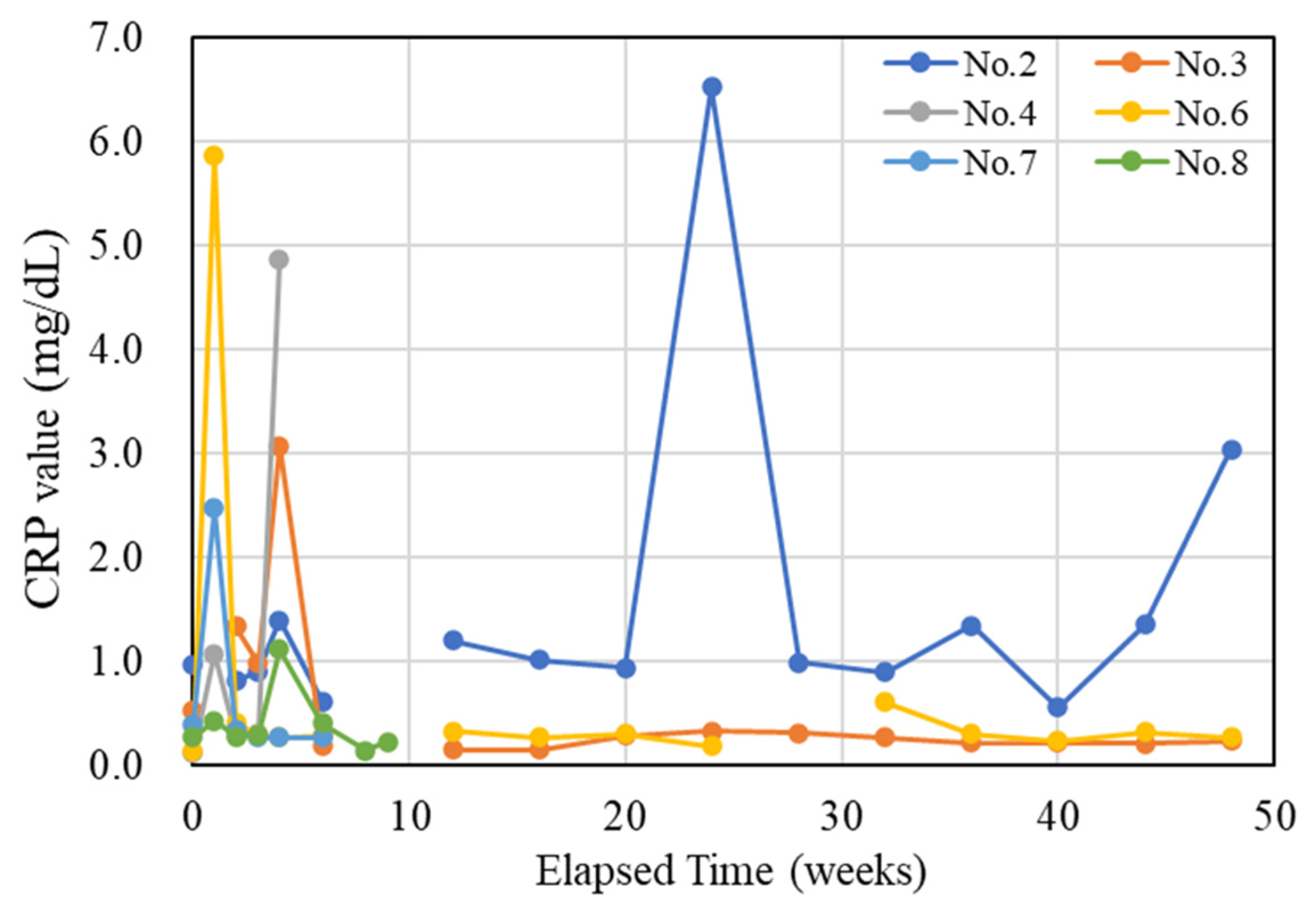 3.2.1. Visual Evaluation of Temporal Changes in Implantation Materials