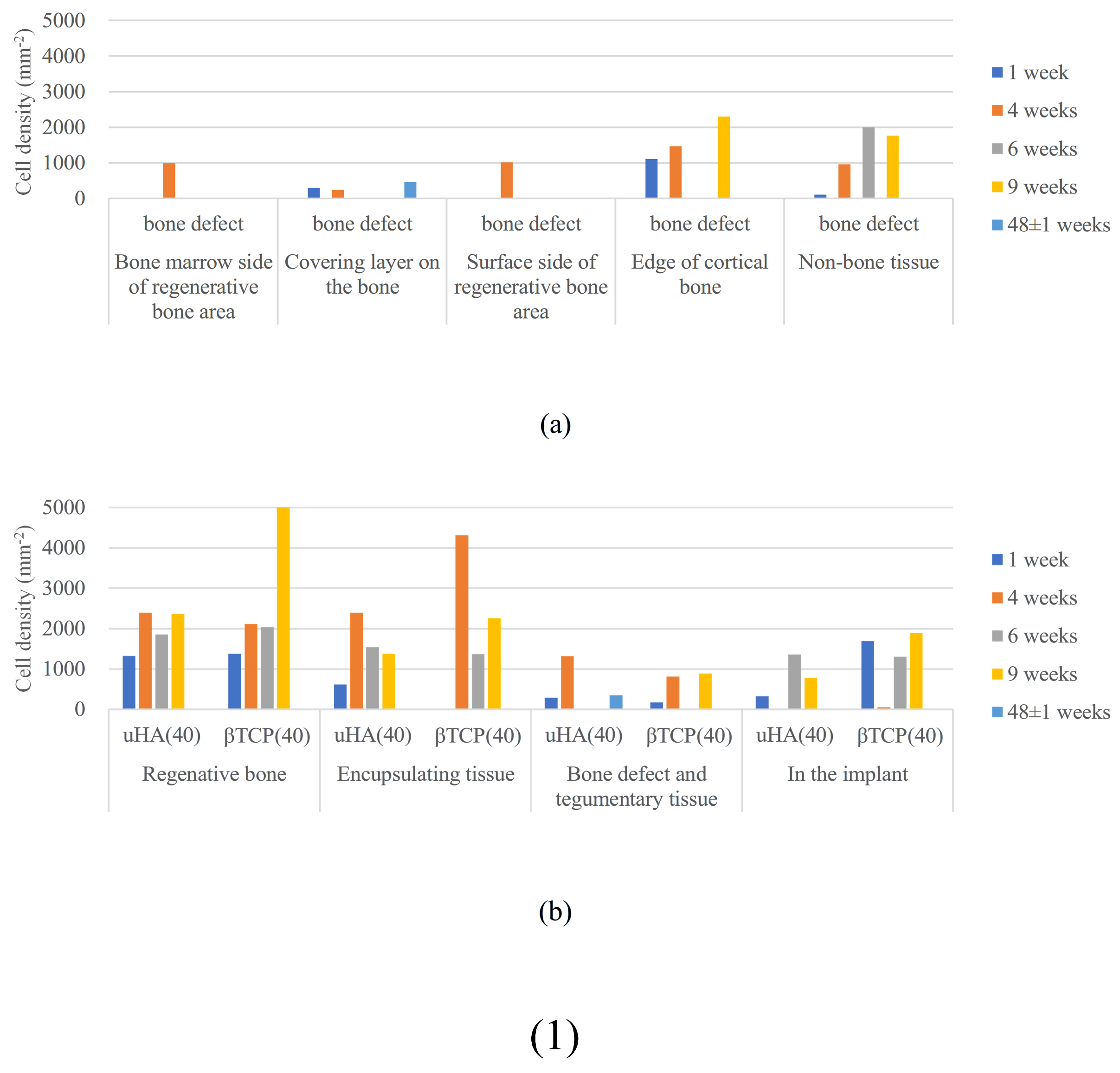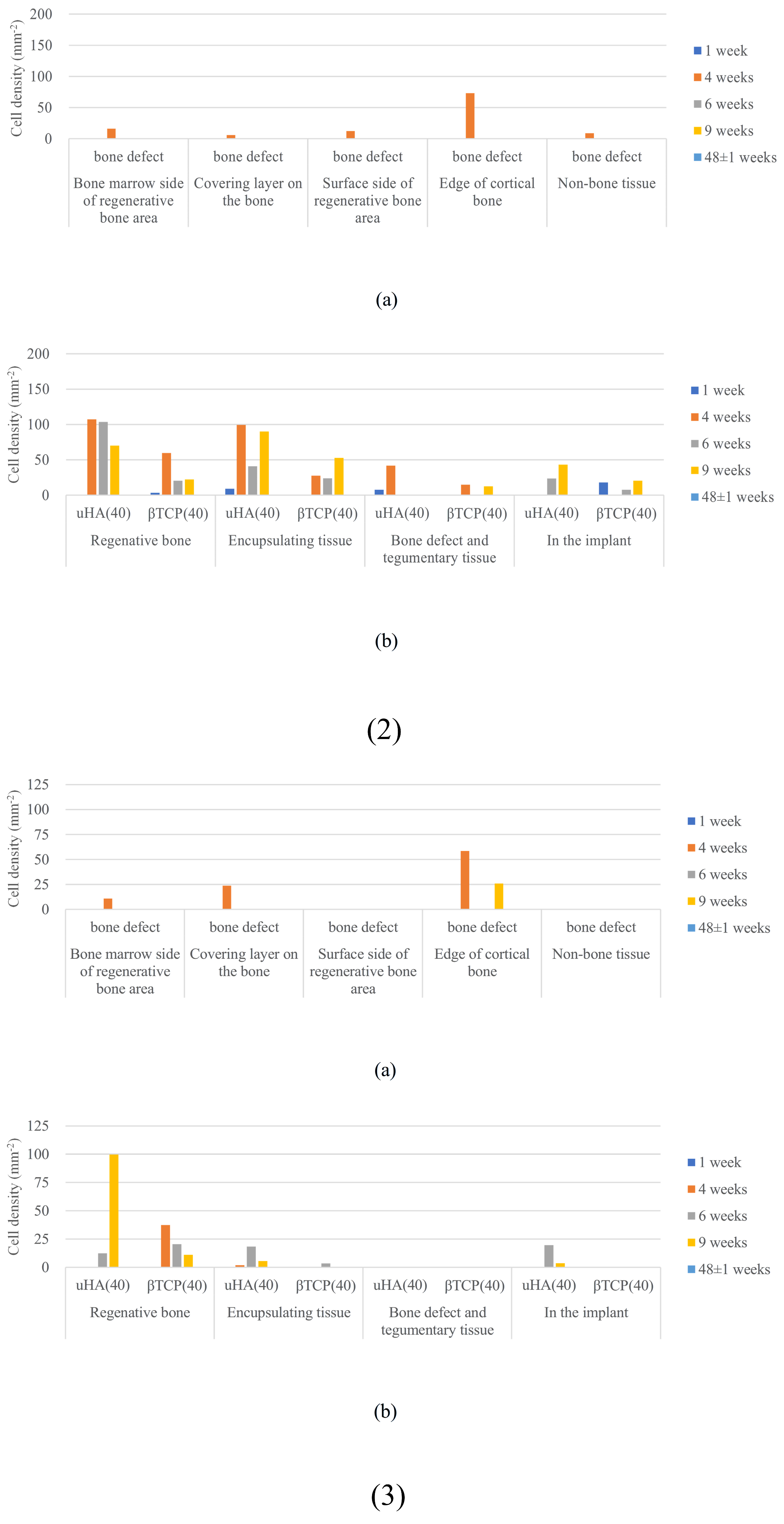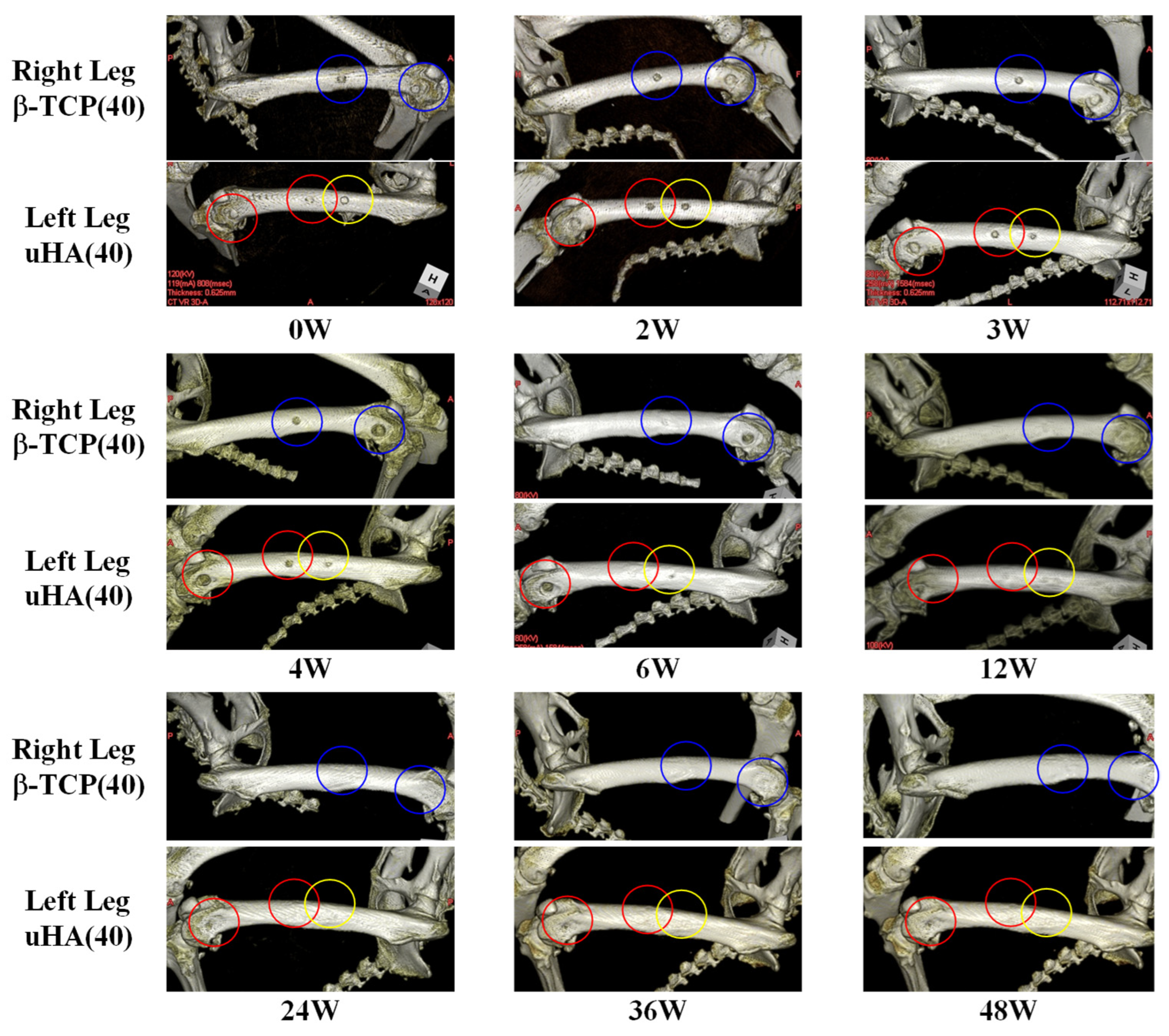 | 7 | uHA(40) ϕ4 × 7 mm | β-TCP(40) ϕ4 × 7 mm | uHA(40) ϕ3 × 5 mm | defect ϕ3 × 5 mm | β-TCP(40) ϕ3 × 5 mm | – | 6 w | 3rd |