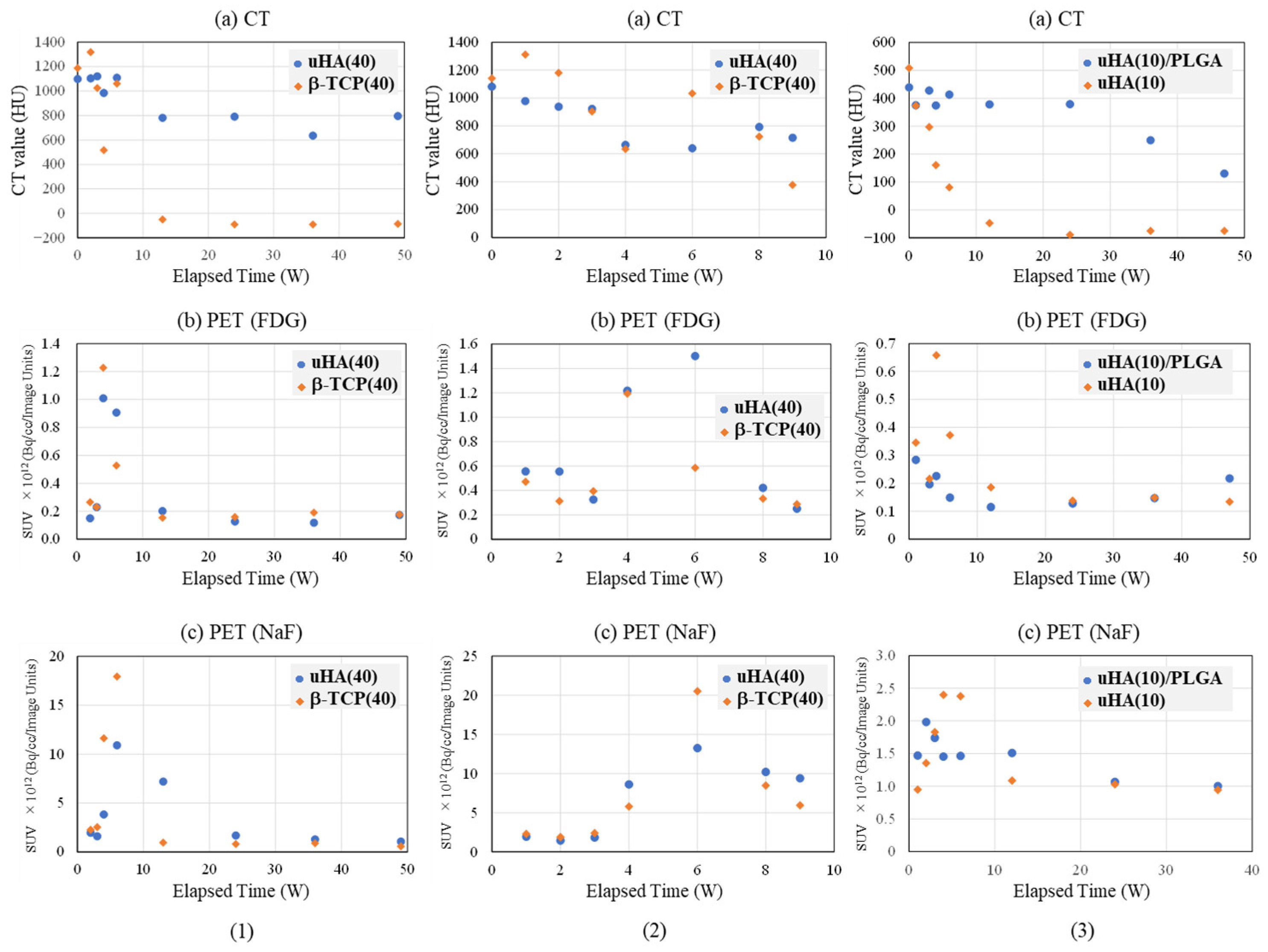 | 1 | uHA(40) ϕ4 × 7 mm | β-TCP(40) ϕ4 × 7 mm | uHA(40) ϕ3 × 5 mm | defect ϕ3 × 5 mm | β-TCP(40) ϕ3 × 5 mm | – | 1 w | 1st |