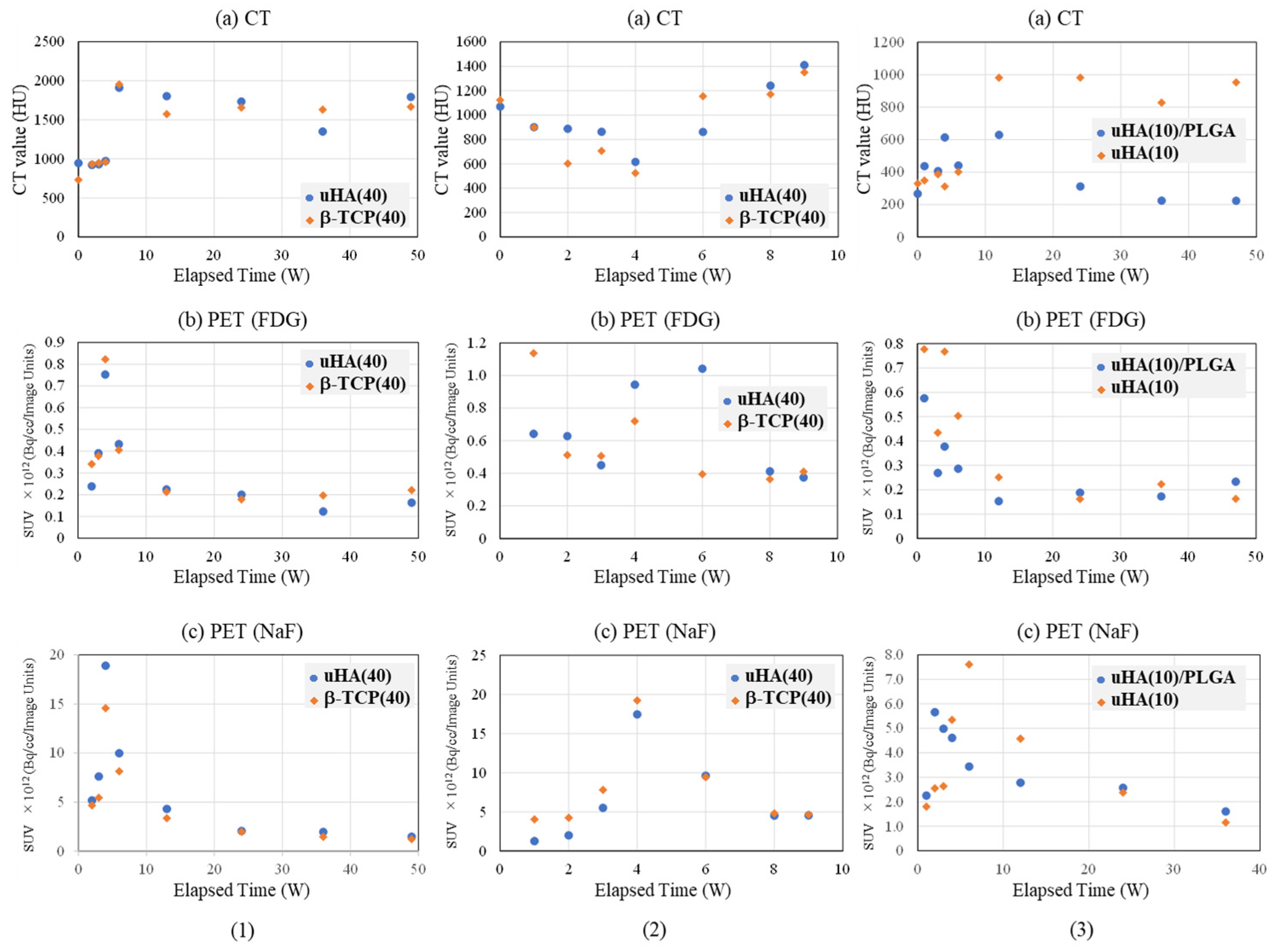 | 6 | uHA(10)/PLGA ϕ4 × 7 mm | uHA(10) ϕ4 × 7 mm | uHA(10)/PLGA ϕ3 × 5 mm | defect ϕ3 × 5 mm | uHA(10) ϕ3 × 5 mm | PDLGA ϕ3 × 5 mm | 48 w | 2nd |