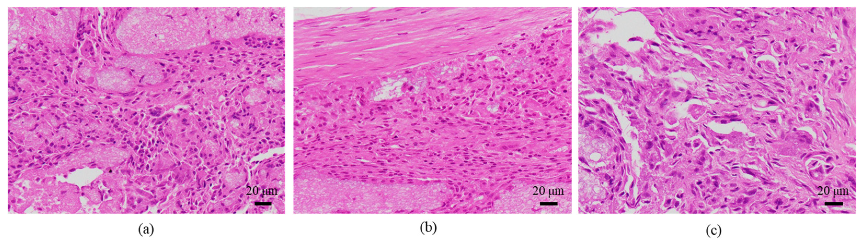 - Bos, R.R.; Rozema, F.R.; Boering, G.; Nijenhuis, A.J.; Pennings, A.J.; Verwey, A.B.; Nieuwenhuis, P.; Jansen, H.W. Degradation of and tissue reaction to biodegradable poly(L-lactide) for use as internal fixation of fractures: A study in rats. Biomaterials 1991, 12, 32–36. [Google Scholar] [CrossRef] [PubMed]