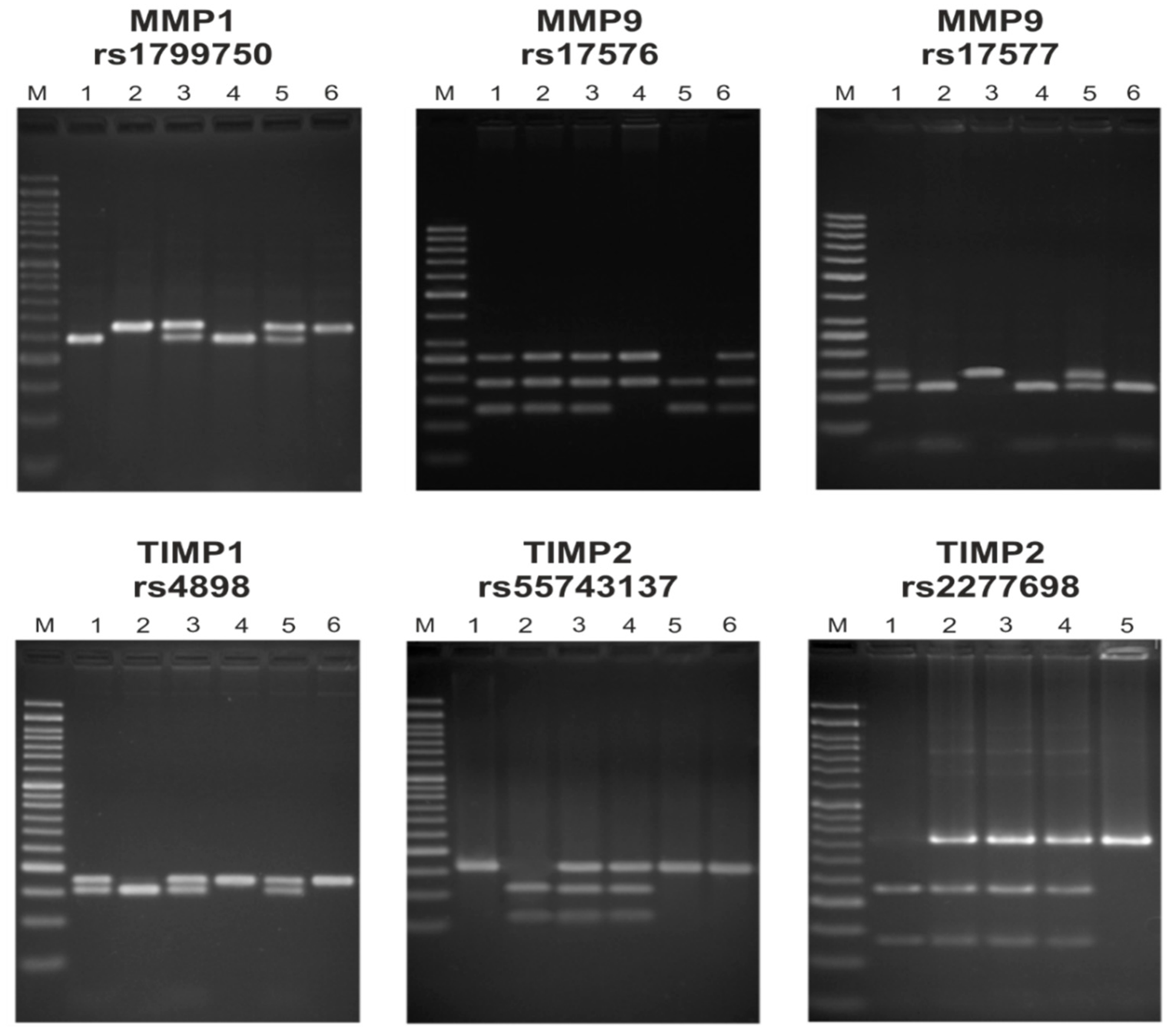 | MMP-9 rs17576 | 5′-GAGAGATGGGATGAACTG-3′ 5′-GTGGTGGAAATGTGGTGT-3′ | 60 °C | MspI (HpaII) | A 252, 187 bp G 187, 129, 123 bp |