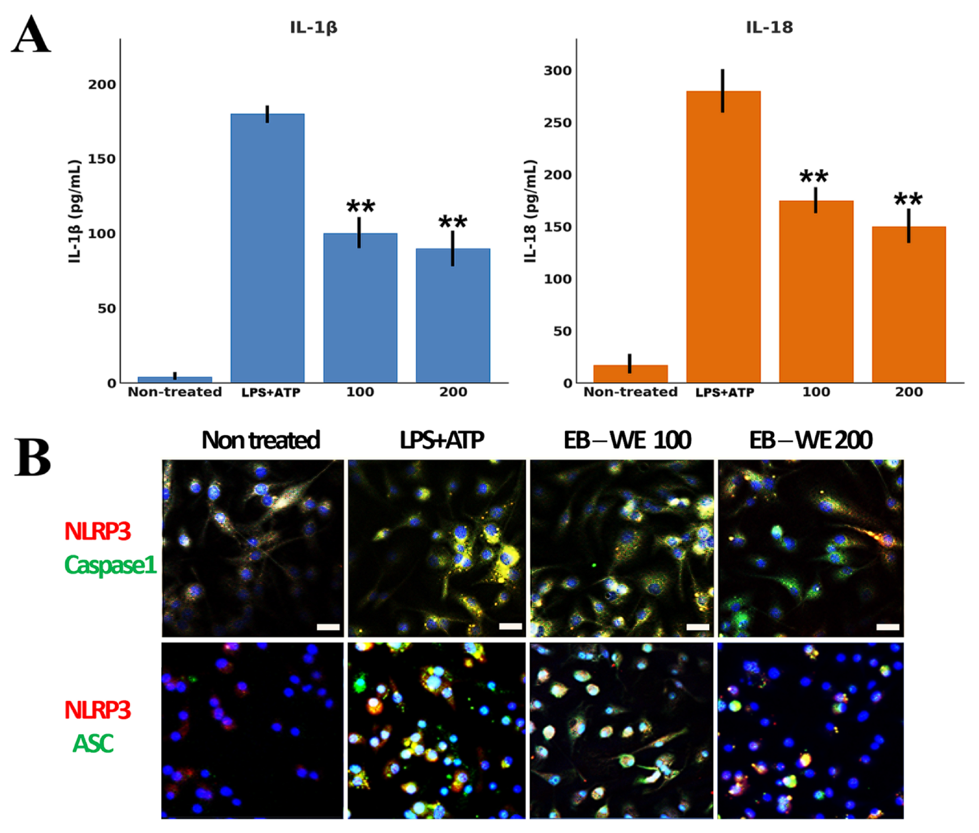 2.2. Inhibition of NLRP3 Inflammasome Formation by EB-WE in BMDMs