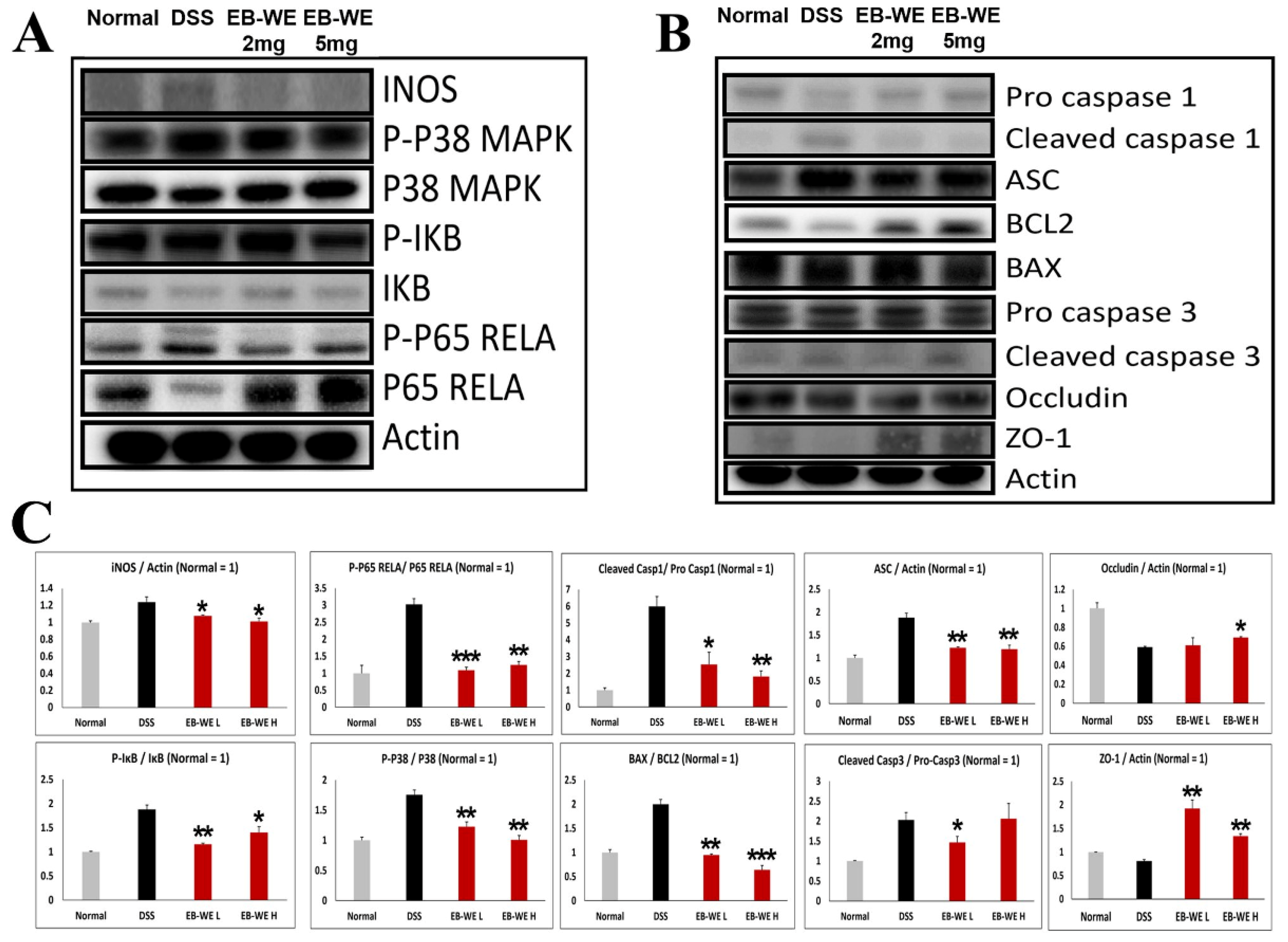2.7. EB-WE Suppresses Inflammatory and Apoptotic Signaling While Preserving Epithelial Barrier Integrity in DSS-Induced Colonic Tissue