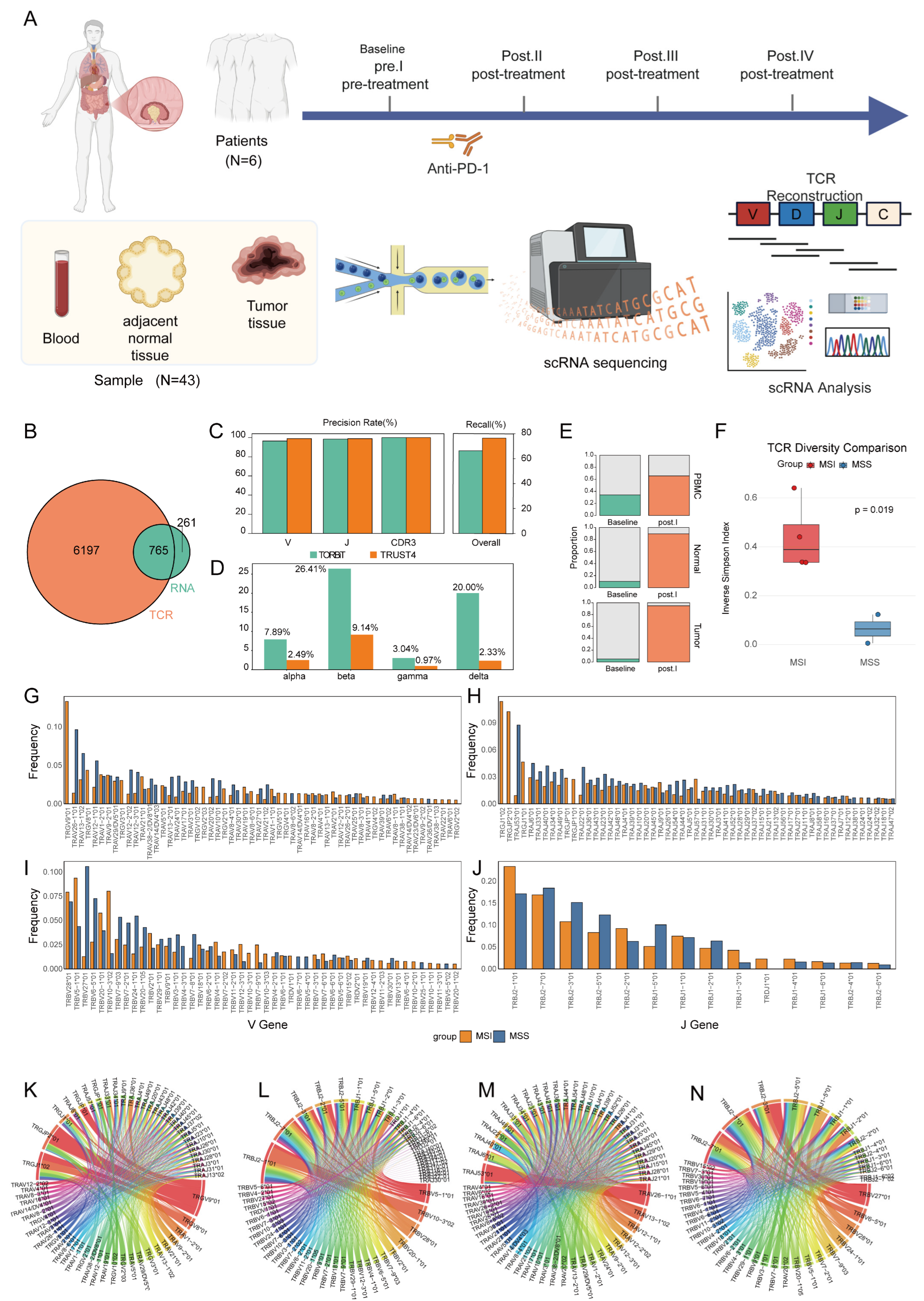 To address these research gaps, we integrated multi-tissue, longitudinal, and paired single-cell data from patients with MSI and MSS colorectal cancer before and after anti-PD-1 therapy, and established a systematic analytical framework. First, by optimizing the TCR reconstruction pipeline, we precisely characterized baseline TCR repertoire features to delineate fundamental differences between MSI and MSS tumors. Second, by analyzing patterns of clonotype sharing, we investigated treatment-driven T-cell selection dynamics. We then mapped clonal dynamics onto specific T-cell functional subsets to elucidate functional state transitions accompanying clonal expansion or contraction. Finally, we evaluated the translational potential of these findings based on key gene features. Overall, this study aims to dissect how microsatellite instability regulates the immune response in colorectal cancer at the clonal level, providing new insights for immune-biological stratification beyond traditional classification.