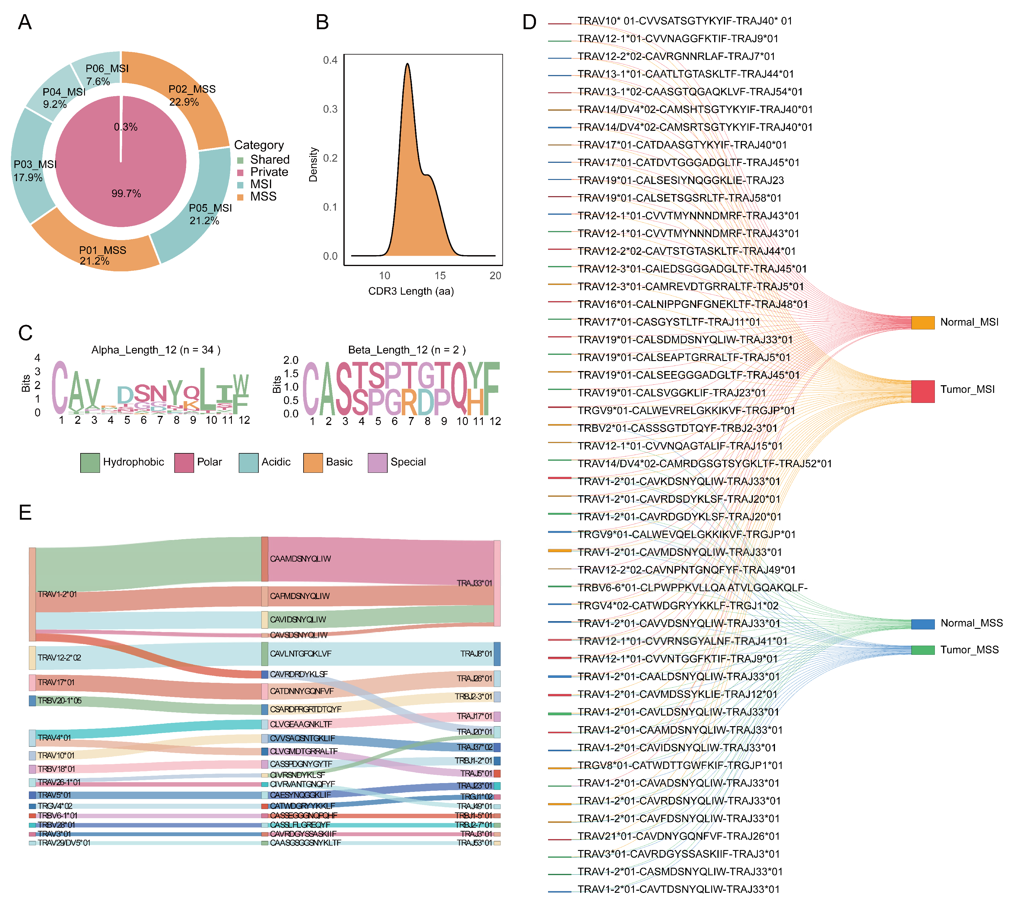 Clonotype sharing was defined as identity in both variable gene selection and CDR3 amino acid sequence for either the α- or β-chain. A clonotype present in only one patient was classified as private. If a clonotype was found in multiple patients within either the MSI or MSS group, it was termed intra-group shared; if it appeared across both MSI and MSS groups, it was designated inter-group shared. To visualize the tissue distribution of highly shared T-cell clonotypes, we constructed Sankey diagrams based on single-cell TCR sequencing data. First, clonotypes present in both normal tissue (Normal) and tumor tissue (Tumor) were selected from the complete clonotype dataset, and the total number of patients carrying each clonotype, as well as the patient count stratified by MSI status, were summarized. The top 50 clonotypes observed in the largest number of patients were selected for further analysis.