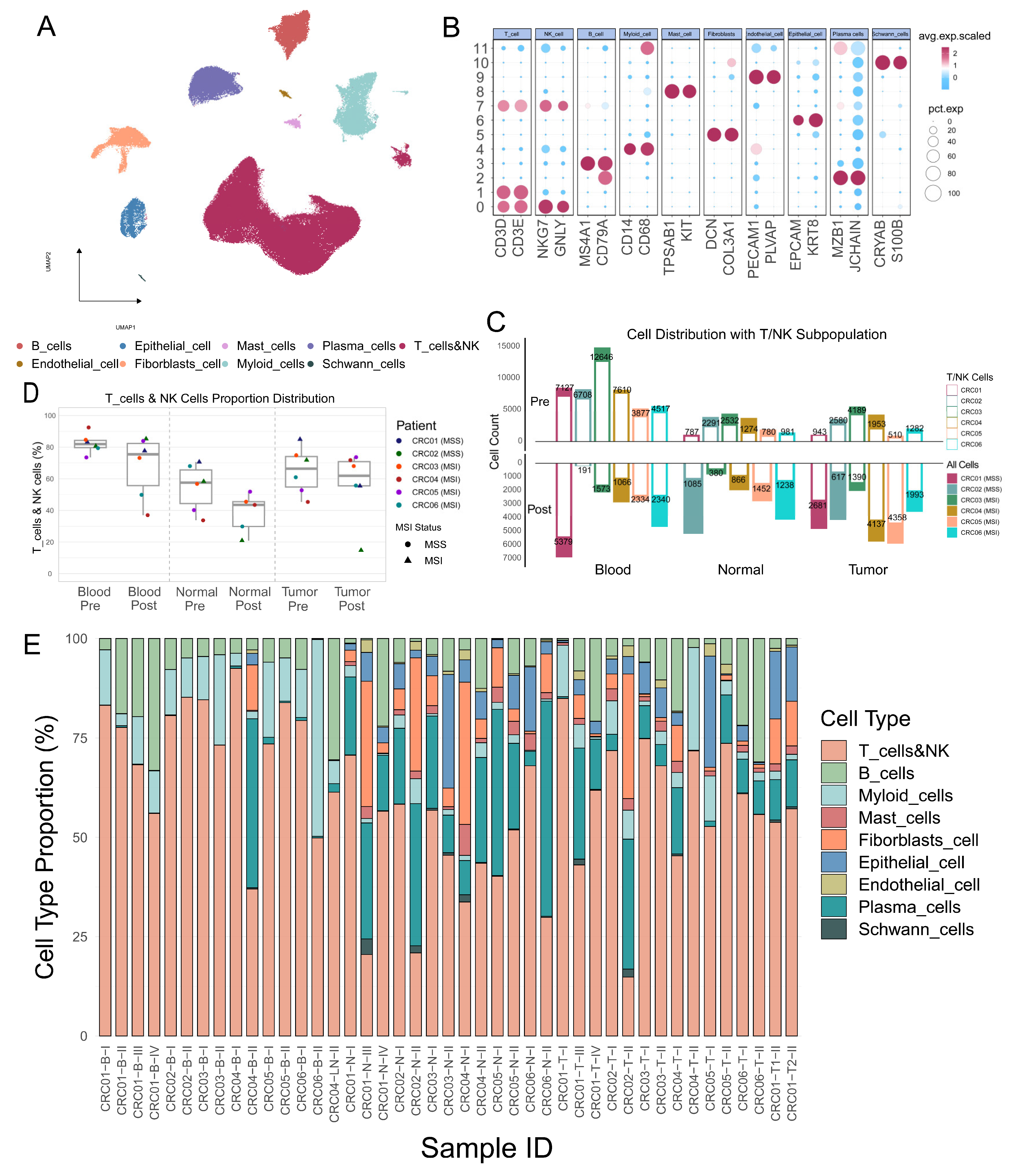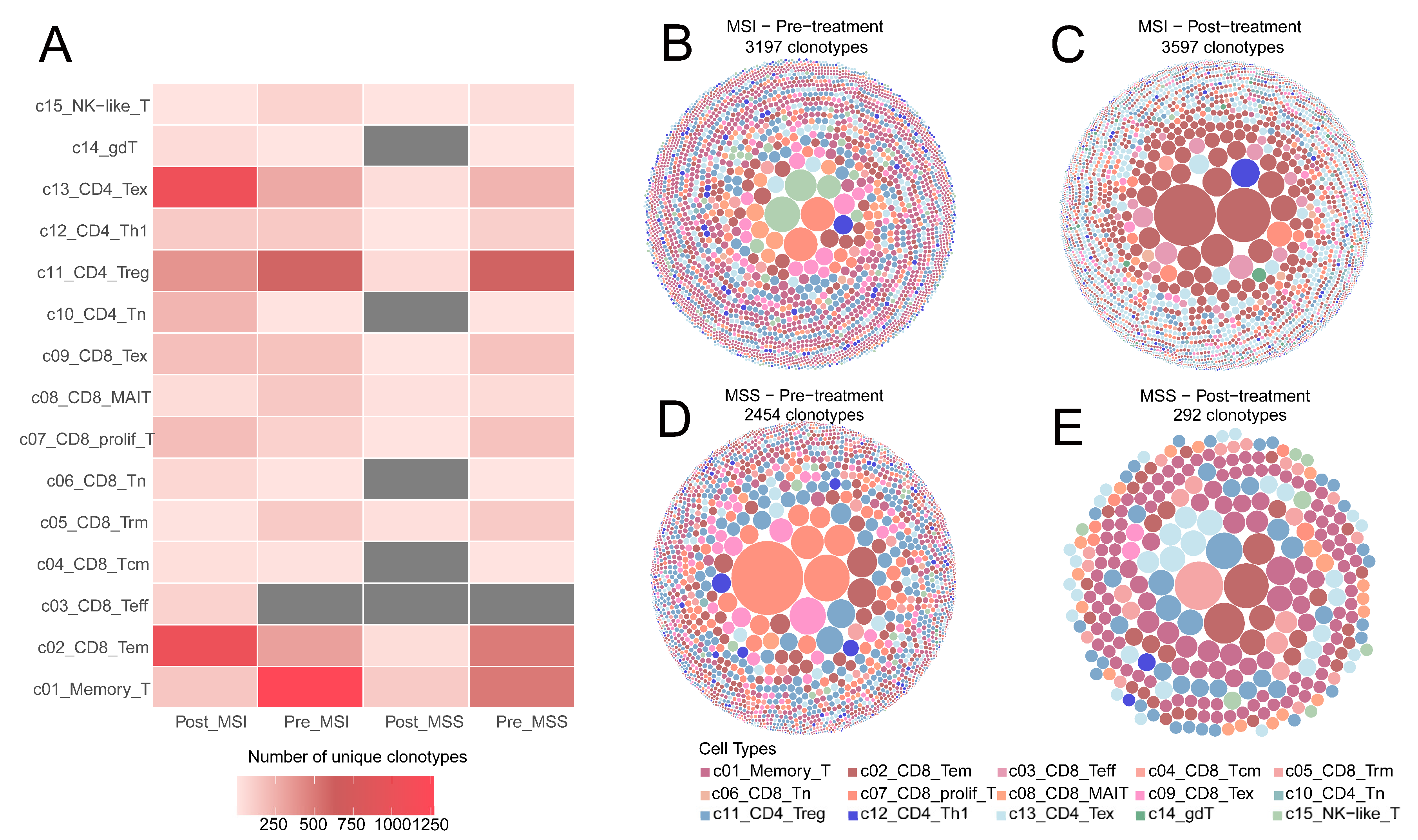 To quantitatively assess T-cell dynamic changes induced by anti-PD-1 therapy under different microsatellite statuses in colorectal cancer, we analyzed the distribution differences in T-cell subtypes between the tumor microenvironment and peripheral normal tissues, as well as changes in clonal size before and after treatment. Calculations were based on single-cell data from each patient at baseline (pre-treatment) and the first post-treatment sampling.
