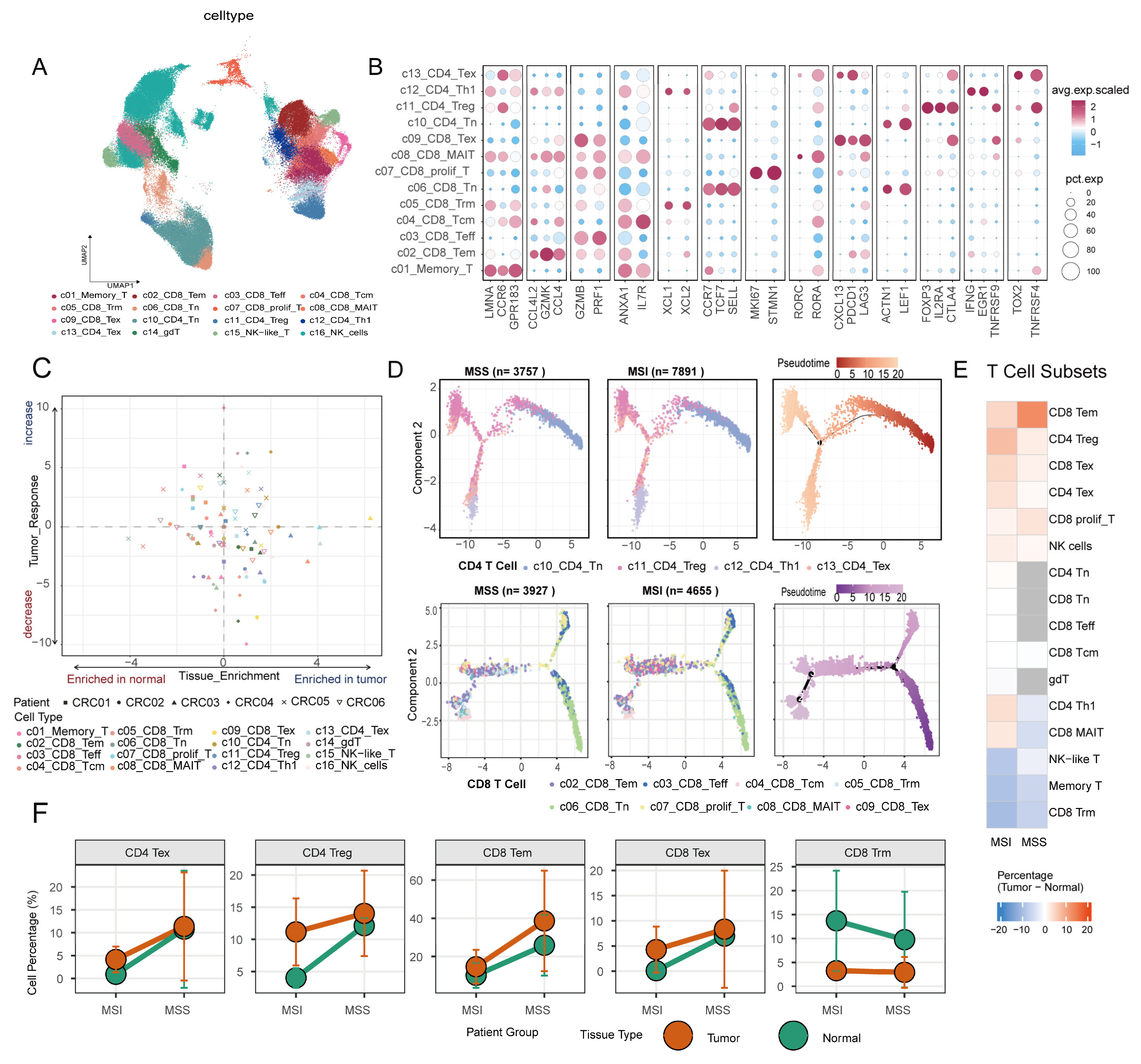 + T-cell populations (e.g., c02_CD8_Tem and c07_CD8_prolif_T), reflecting sustained and intense immune activation. At the same time, terminally exhausted T cells (c13_CD4_Tex and c09_CD8_Tex) and Treg cells (c11_CD4_Treg) were markedly expanded, with the magnitude of exhausted clone expansion exceeding that of effector clones. This “high-fluctuation-deep exhaustion” clonal trajectory suggests that, although the MSI microenvironment possesses strong activating capacity, it can rapidly drive newly generated effector T cells into irreversible dysfunction. This provides a plausible explanation for primary resistance to PD-1 inhibitors in a subset of MSI patients: once T cells have entered terminal exhaustion under multiple suppressive cues, blockade of the PD-1 pathway alone may be insufficient to restore function [
