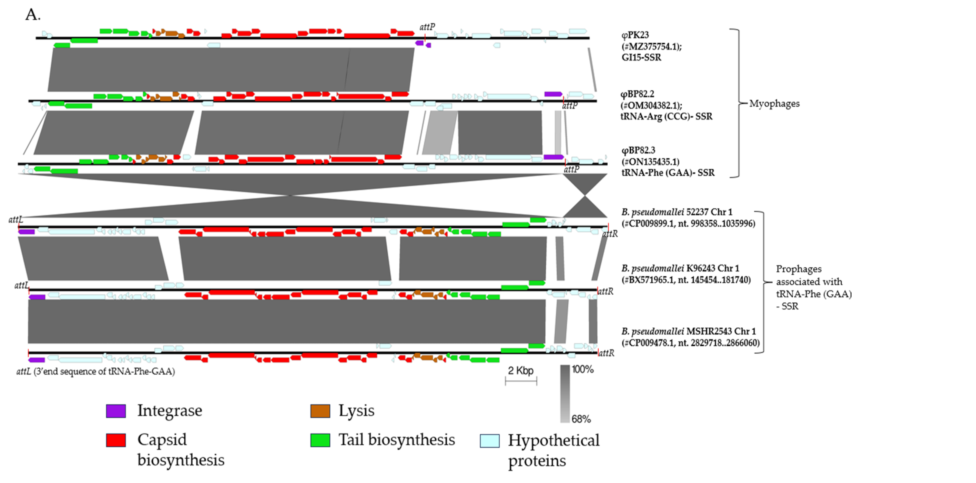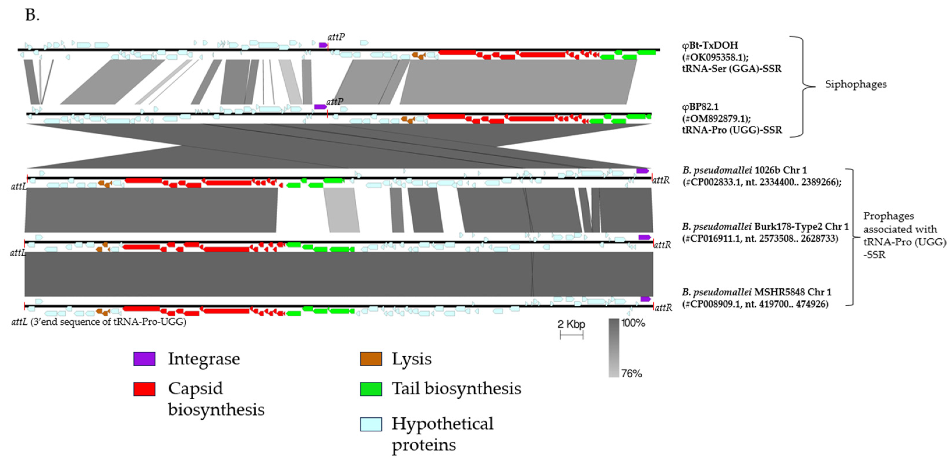 - Khrongsee, P.; Irby, I.; Akaphan, P.; Alami-Rose, M.A.; Kaewrakmuk, J.; Tuanyok, A. A comprehensive study of prophage islands in Burkholderia pseudomallei complex. Front. Bacteriol. 2024, 3, 1339809. [Google Scholar] [CrossRef]