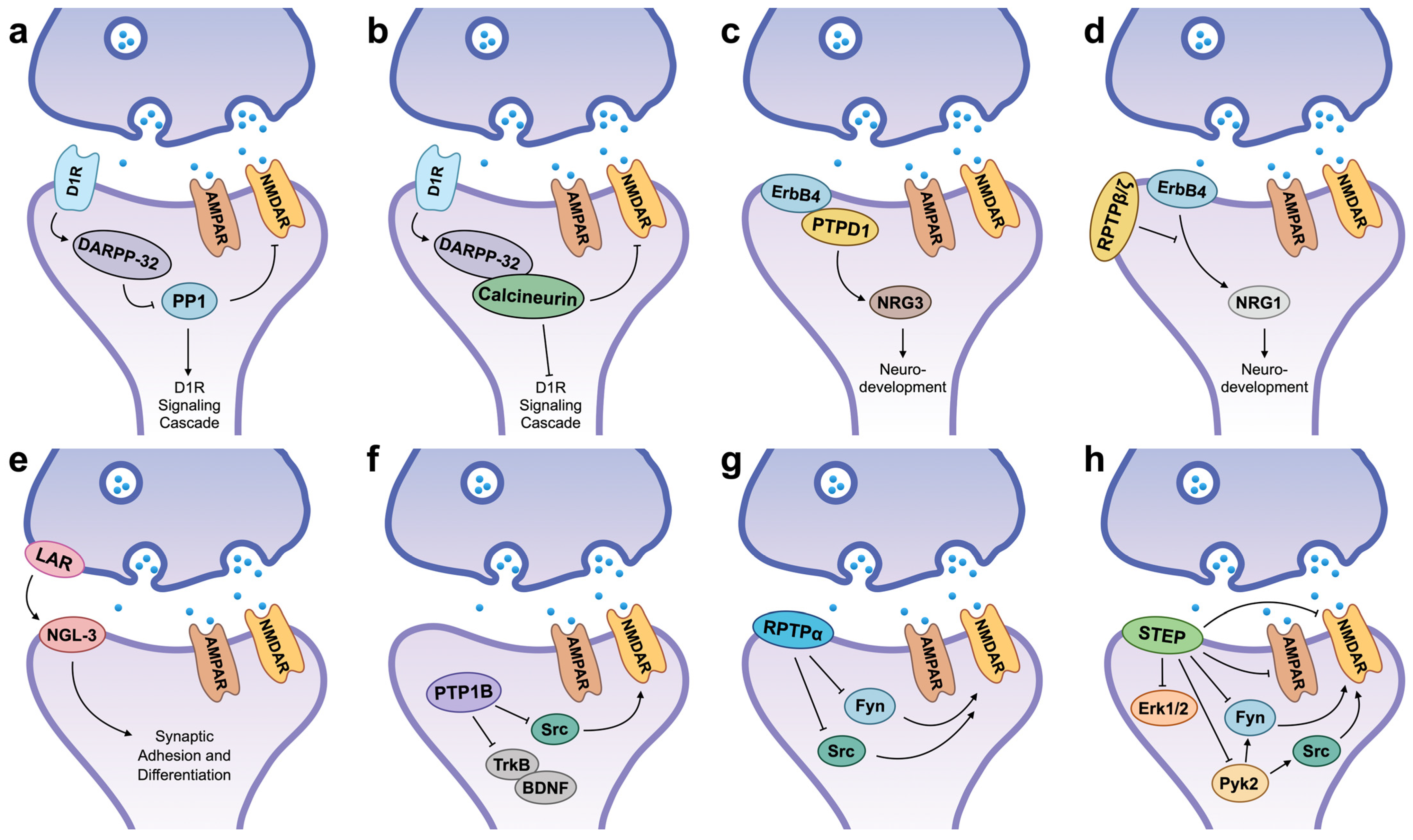 | STEP (PTPN5) | Non-receptor PTP | NMDARs, AMPARs, ERK1/2, Fyn, Pyk2 | Directly dephosphorylates synaptic receptors and signaling kinases, biasing synapses toward LTD and reducing excitatory transmission | Some nominally associated SNPs and significant haplotypes | Increased levels in DLPFC (mixed results across studies) | Increased levels in patient-derived hiPSC neurons | Knockout or inhibition rescues schizophrenia-like behavioral and cellular phenotypes | Post-mortem inconsistency (medication status may stratify); no genetic link despite strong functional evidence | [23,65,66,67,68,69] |