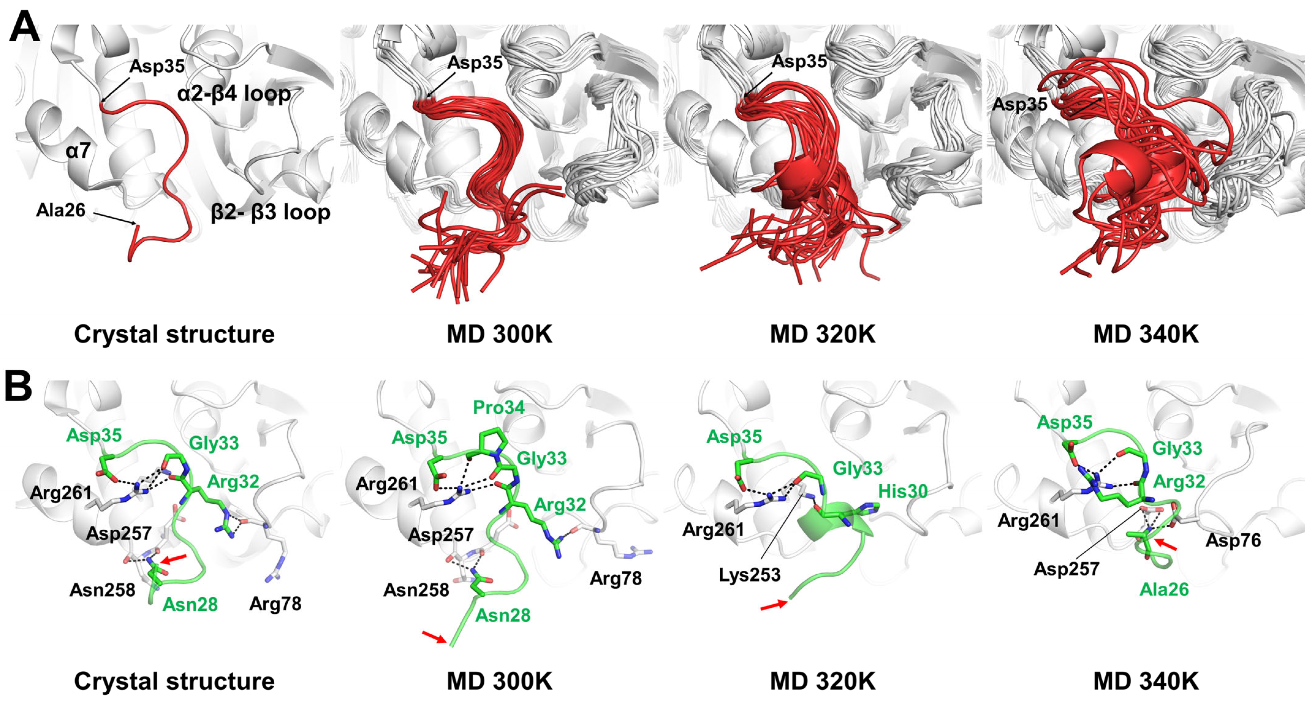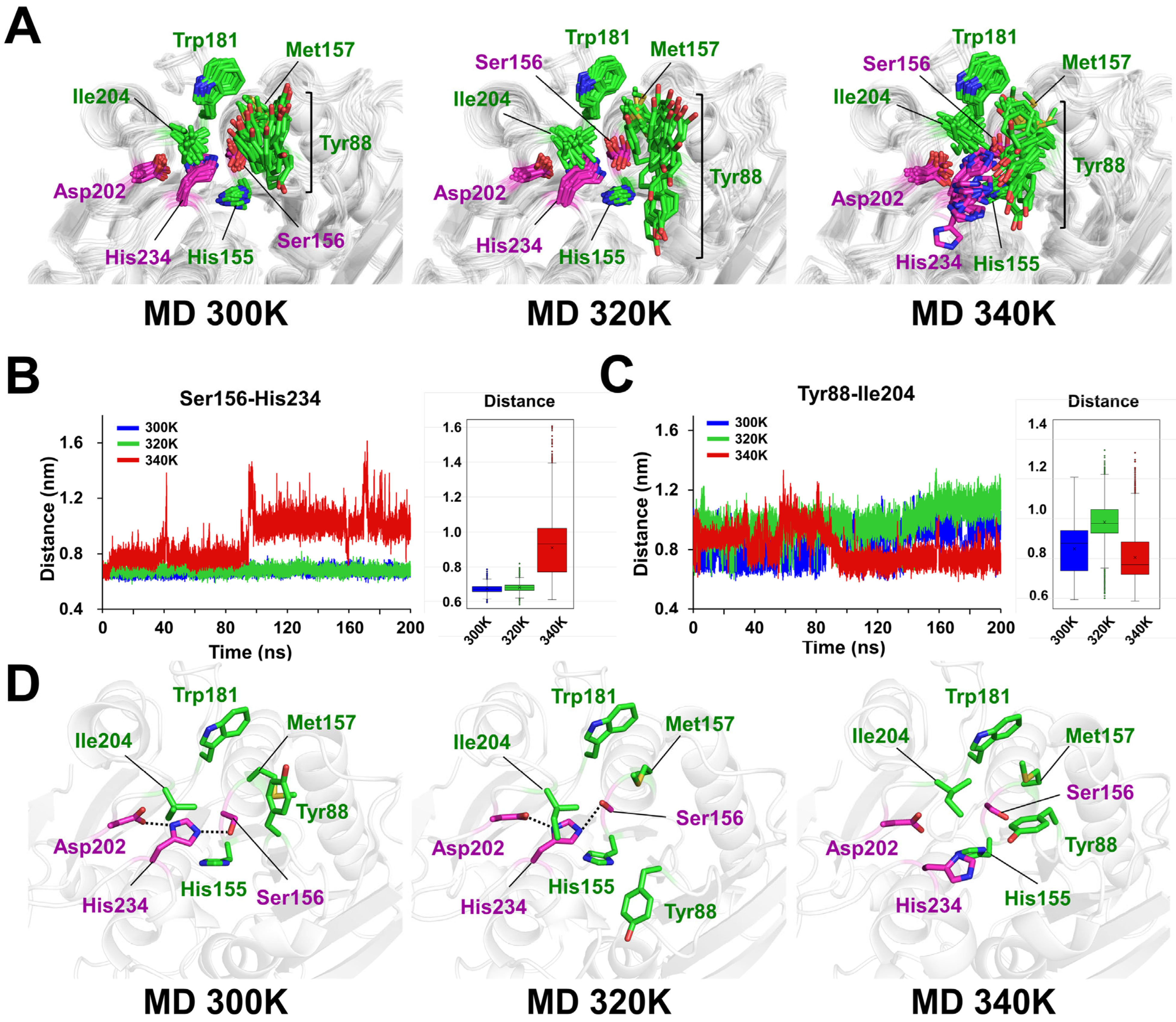 2.3. Temperature-Dependent Conformational Changes in the Active Site and Substrate-Binding Cleft