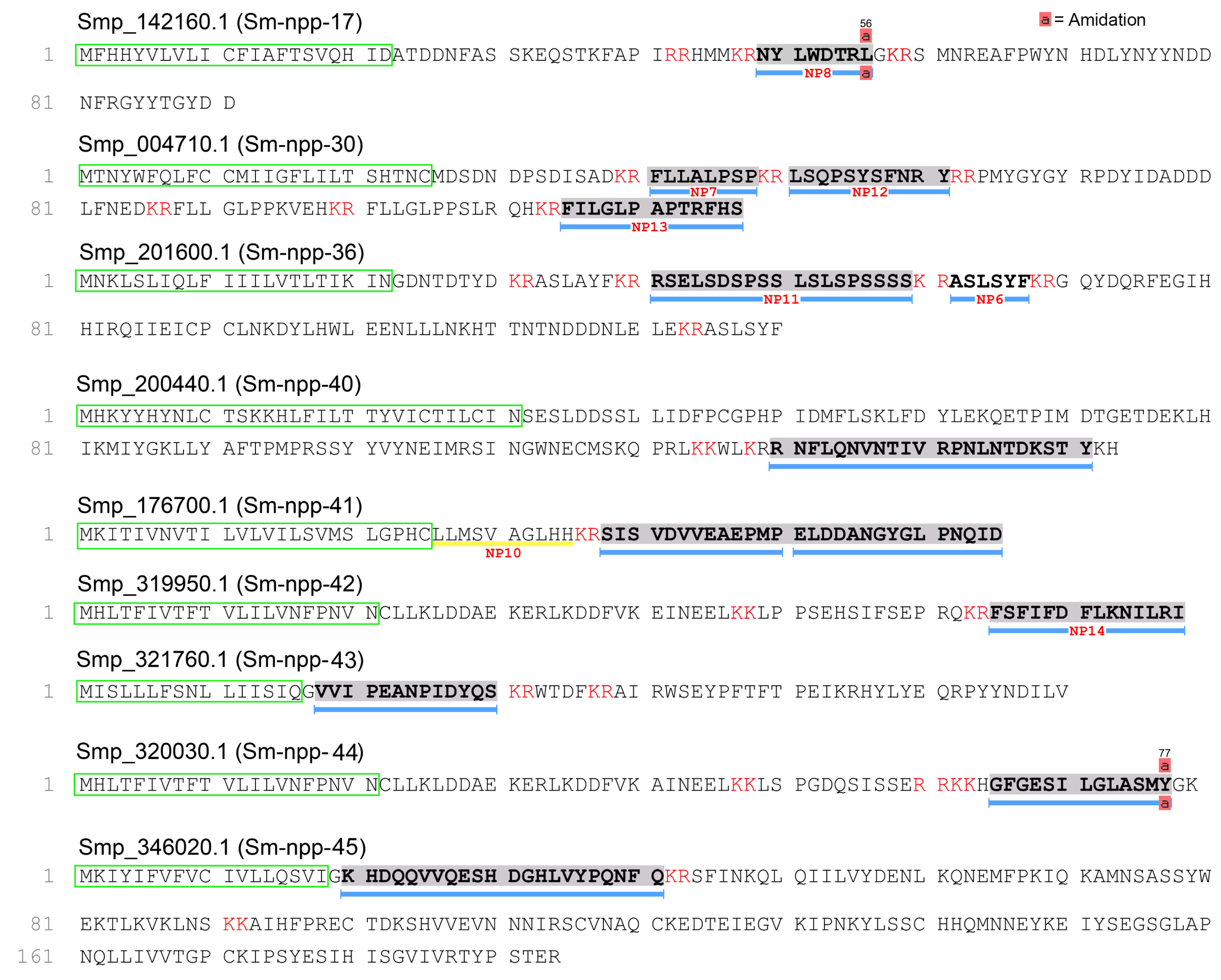 | NP8 | NYLWDTRL-NH2 | 1079.21 | Smp_142160.1 (Sm-npp-17) |
