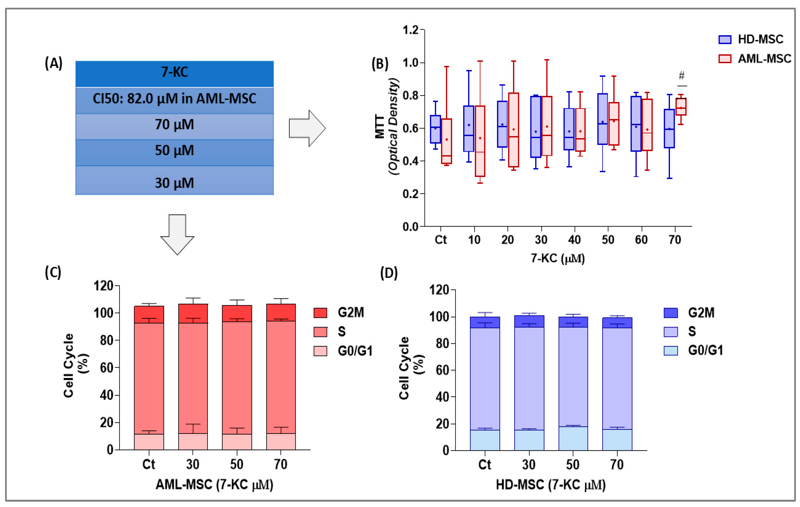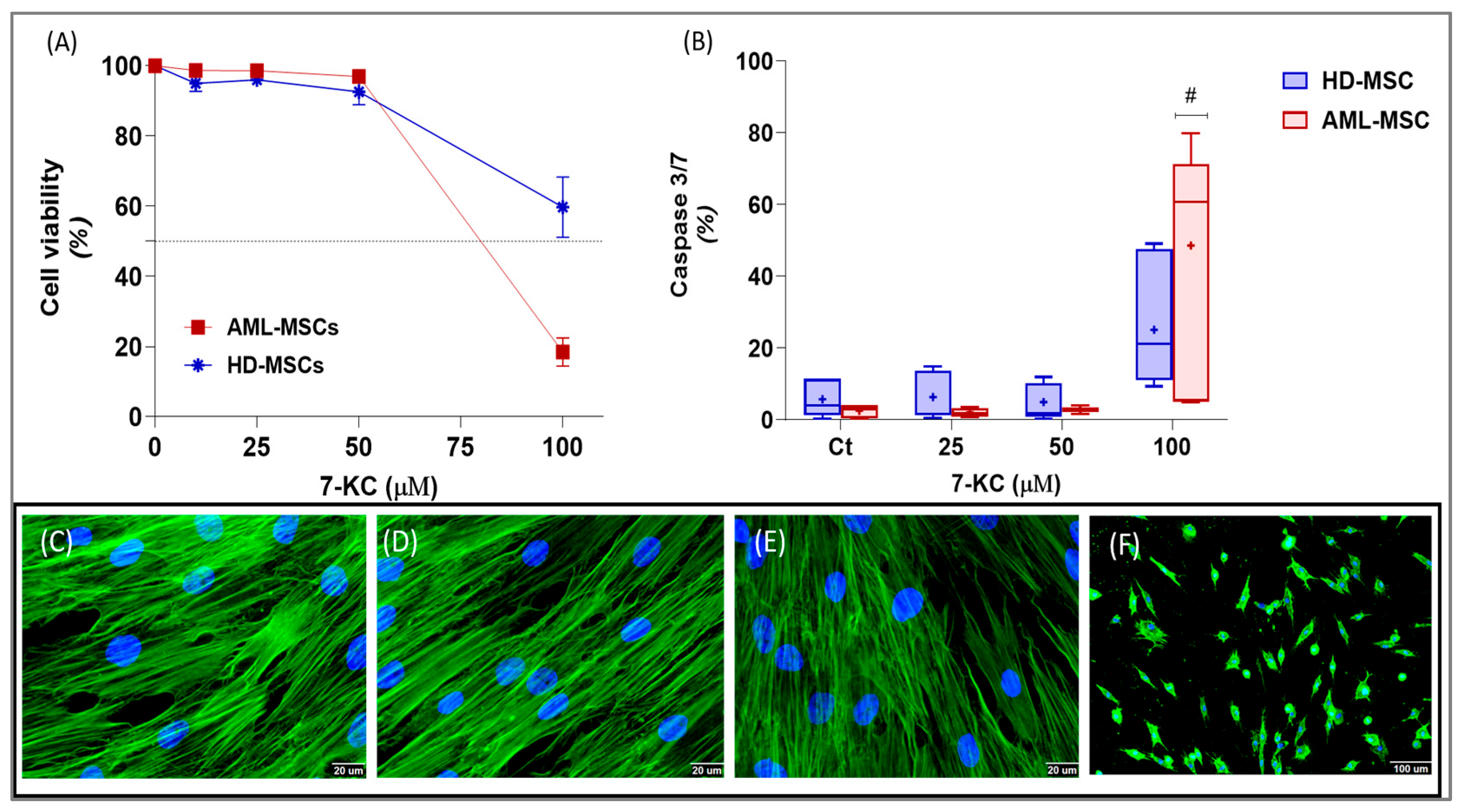 To initially assess the cellular response to 7-KC, we evaluated its cytotoxic effects in HD-MSCs and AML-MSCs at concentrations of 10 µM, 25 µM, 50 µM, and 100 µM. A clear difference in the mean inhibitory concentration (IC