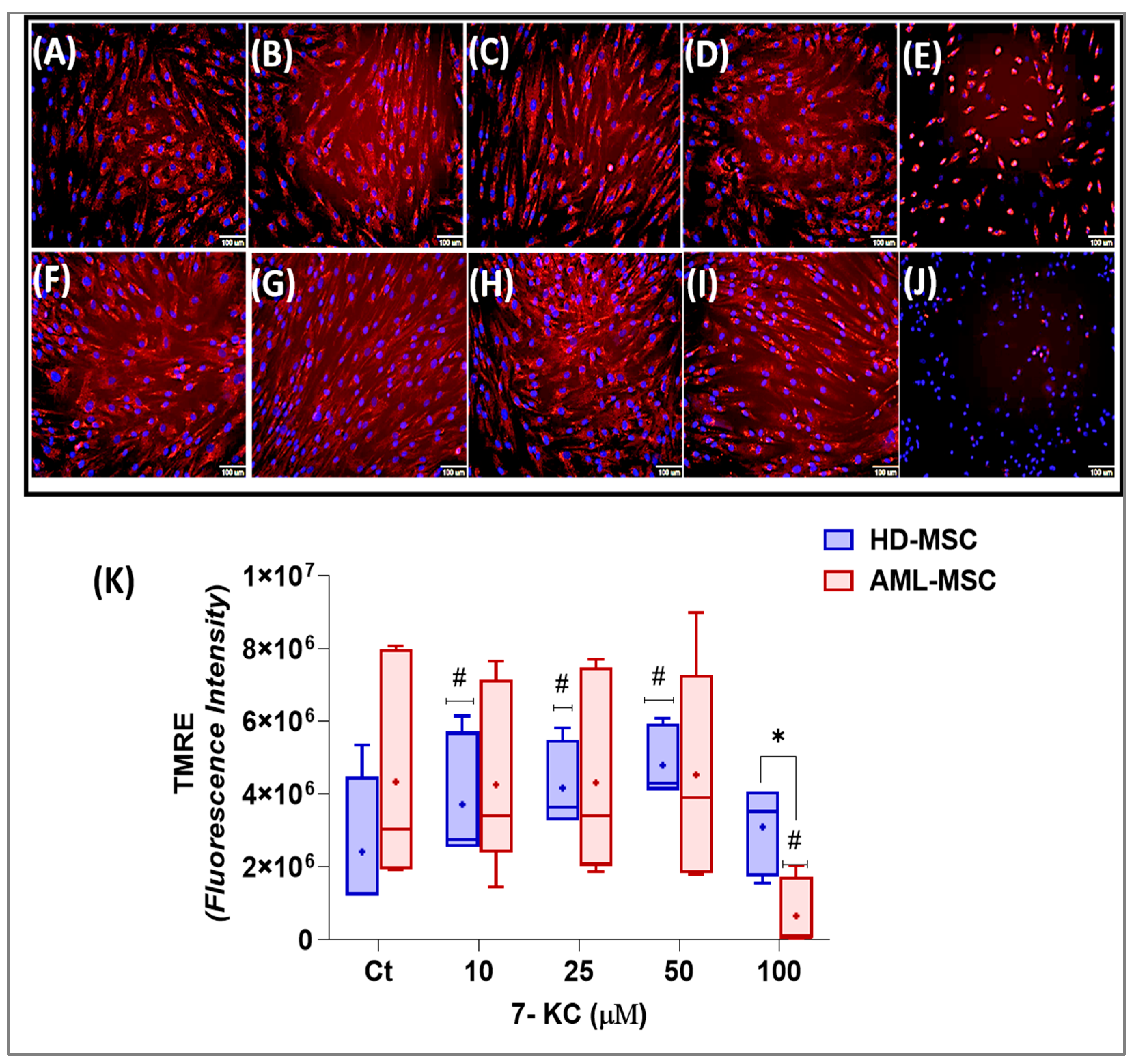 Visual inspection revealed differences in staining patterns and mitochondrial architecture between HD-MSCs and AML-MSCs treated with 10, 25, 50 or 100 µM 7-KC (