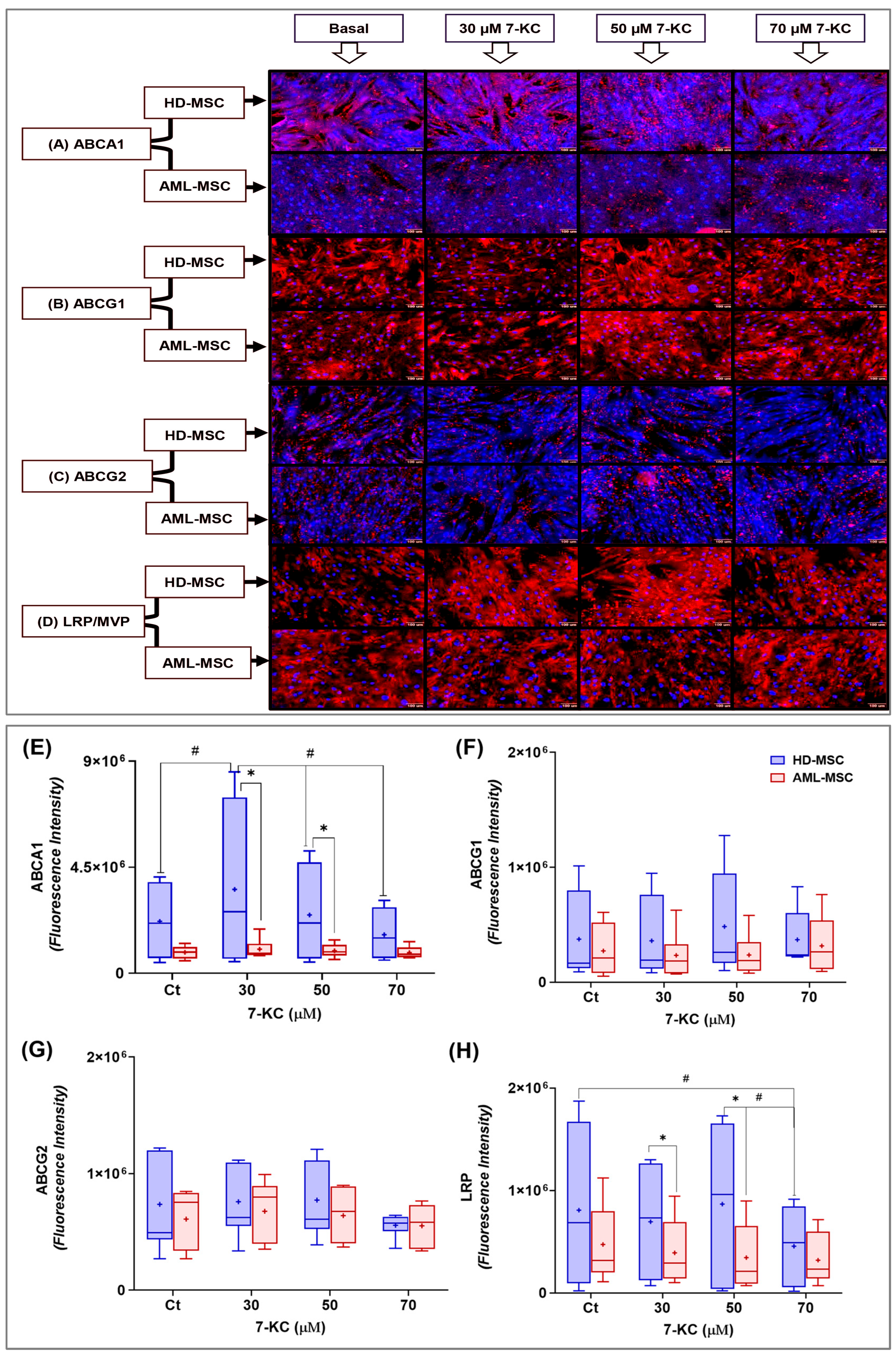 77], in MSCs treated with subtoxic concentrations. Our data indicate that 7-KC promotes selective remodeling of the ABCA1/ABCG1 axis in HD-MSCs, whereas AML-MSCs display reduced plasticity, maintaining low ABCA1 levels and showing more discrete changes in ABCG1. Under our experimental conditions, we did not detect ABCC1 or ABCC2, and we observed only modest modulation of ABCG2. Together, these findings suggest that, in bone marrow stromal cells, the impact of 7-KC is more closely related to lipid homeostasis and stress adaptation than to a broad induction of canonical xenobiotic efflux pumps.
